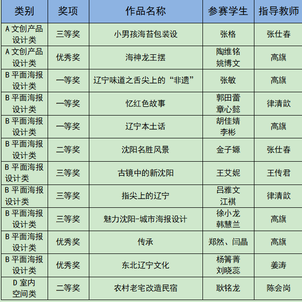 近日,2021年辽宁省大学生城市文化创意设计大赛成绩公布,我院学生在三个类别中共获得一等奖3项、二等奖2项、三等奖4项、优秀奖3项。