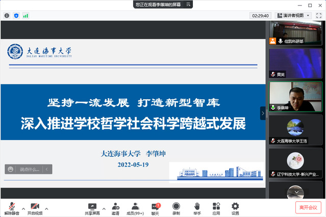 5月19日上午,由辽宁省社科联组织的辽宁省社科联第十期服务决策培训班暨基地建设交流会在线上召开。省社科联党组书记、主席石坚、省社科联科研工作部部长李红,省社科联所属基地负责人、首席专家、科研骨干等200余人参会。我校辽宁省区域经济发展研究基地(海洋经济发展与法律政策研究)首席专家、太阳成集团tyc33455ccww院长裴兆斌教授、基地成员曲亚囡副教授、刘洋副教授、刘笑晨老师、邵宏润老师参加本次培训交流会。