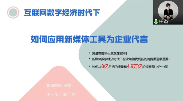 主讲嘉宾任杰围绕“流量在哪里生意就在哪里!”、“新媒体数字经济时代下企业如何找到新的消费渠道很重要!”、“如何从8亿日活的流量和4.9万亿的销售额中分一点?”等焦点,结合自己的就业经历,以公司旗下的抖音为例进行深度解读。对于流量计算,企业入局布局,如何打造企业号,设计平台IP形象等多重问题进行数据分析,还对同学们所提出的几个关切问题进行了细致讲答。