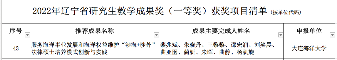 近日,辽宁省教育厅公布2022年辽宁省研究生教育教学成果奖获奖名单,经学校申报、专家评审、会议审议、网上公示,确定特等奖36项,一等奖68项,二等奖215项。其中,太阳成集团tyc33455ccww申报的“服务海洋事业发展和海洋权益维护‘涉海+涉外’法律硕士培养模式创新与实践”教学成果获得2022年辽宁省研究生教育教学成果奖一等奖。