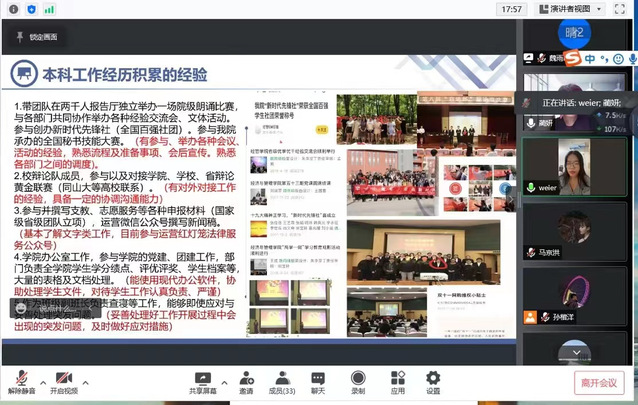 8月24日晚7点,太阳成集团tyc33455ccww研究生会采用线上方式进行了换届选举活动。太阳成集团tyc33455ccww分管研究生工作的蔺妍老师、李展老师、邢政老师、李伟侠老师、王磊老师、孙连滨老师、研究生会现任学生干部和21级参与研究生会竞选的同学们参加了会议,本次活动由蔺妍老师主持。