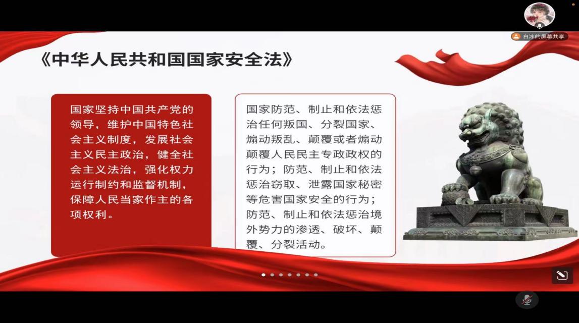 白冰同学的讲座主题是《从政治安全看总体国家安全观》。她从总体国家安全观、政治安全、价值与实践三个方面论述政治安全是总体国家安全观的根本,并强调高校学生要不断增强政治敏锐性和政治鉴别力,不断提高防范和抵御政治风险的能力,牢牢掌握维护政治安全的主动权。