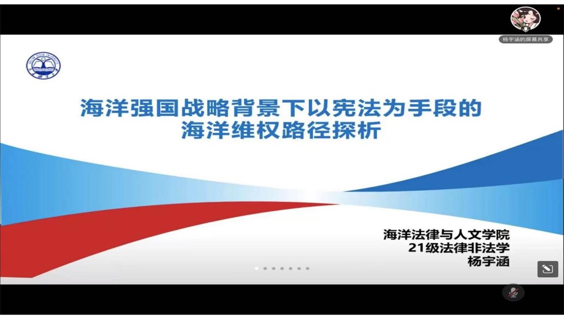 杨宇涵同学的讲座主题是《海洋强国战略背景下以宪法为手段的海洋维权途径》。她介绍了当下海洋强国战略背景和涉海问题入宪的重要性,将涉海问题写进宪法,有助于解决我国目前在海洋维权领域存在的问题,既是海洋政治斗争中的一种选择,亦是新时代海洋强国战略下以宪法为路径的海洋维权方式。