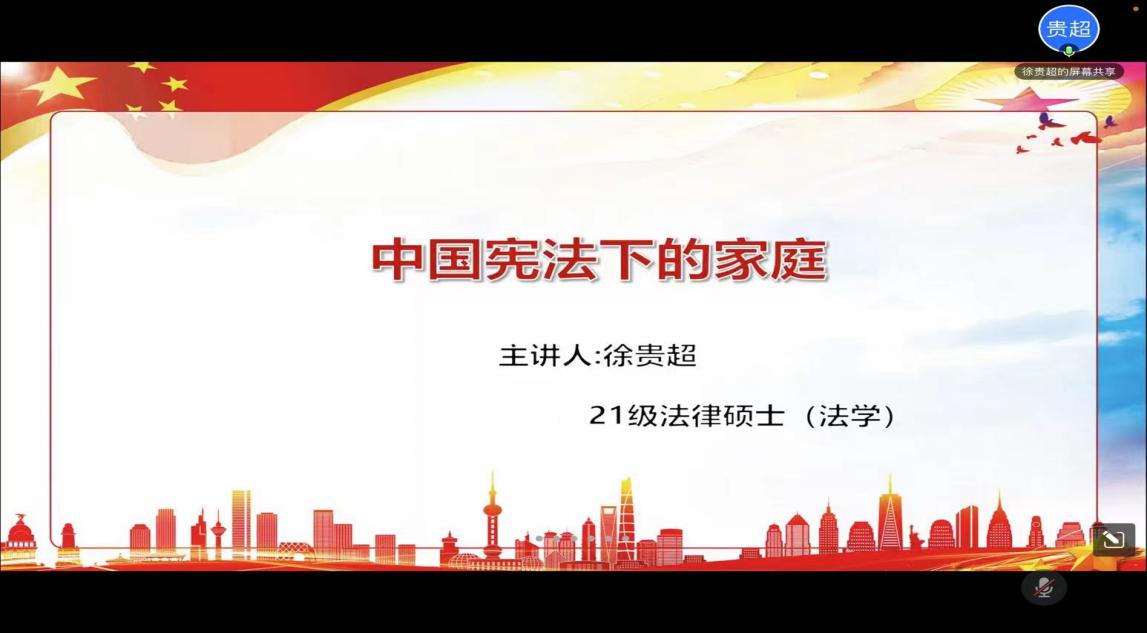 徐贵超同学的讲座主题是《中国宪法保护下的家庭》。他从家庭在国家和社会中的重要功能和价值出发,并在此基础上讲述了宪法守护家庭的基本措施,包括家庭内部男女平等、维护婚姻保护家庭、父母之慈子女之孝、保护弱势群体等等。