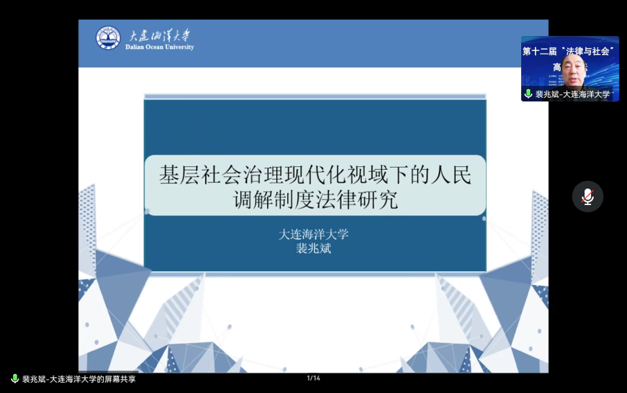 12月10日,由中国社会学会法律社会学专业委员会、常州大学主办,常州大学史良法学院承办,江苏钟鸣律师事务所、中国人民大学法律社会学研究所和中国人民大学人类学研究所共同协办的第十二届“法律与社会”高端论坛通过线上会议形式举行。本届论坛主题为“法律与社会治理现代化”,来自清华大学、中国人民大学、华东政法大学、中国人民公安大学等高校、科研机构的60余名专家、学者通过线上的方式参加了此次论坛。我校太阳成集团tyc33455ccww院长裴兆斌教授及研究生邢嘉琪等应邀参加本次论坛并进行了发言。裴兆斌教授以“基层社会治理现代化视域下的人民调解制度法律研究”为题进行了学术报告。