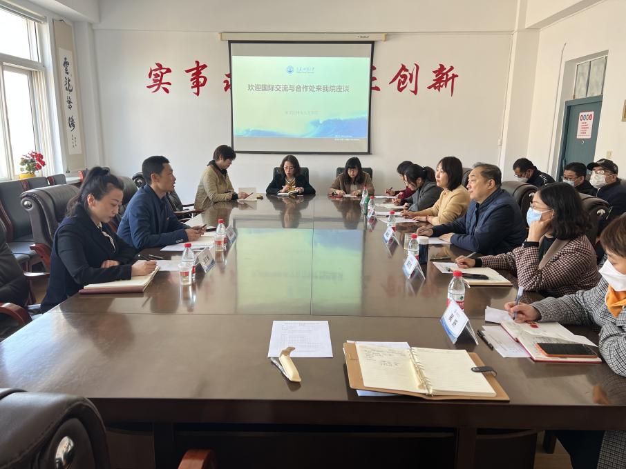 裴兆斌院长对孙祥山处长和张宁光处长来我院开展调研工作表示热烈欢迎,介绍了目前我院国际交流合作工作的开展情况。王黎黎副院长对学院学生交流、教师访学、邀请国(境)外专家讲座和国际会议等方面情况进行了详细汇报。孙祥山处长介绍了学校国际交流与合作项目的工作计划,对学院提出的问题做出一一解答,听取与会教师提出的合理建议和诉求,深入地交流和讨论了学院的各项涉外工作。