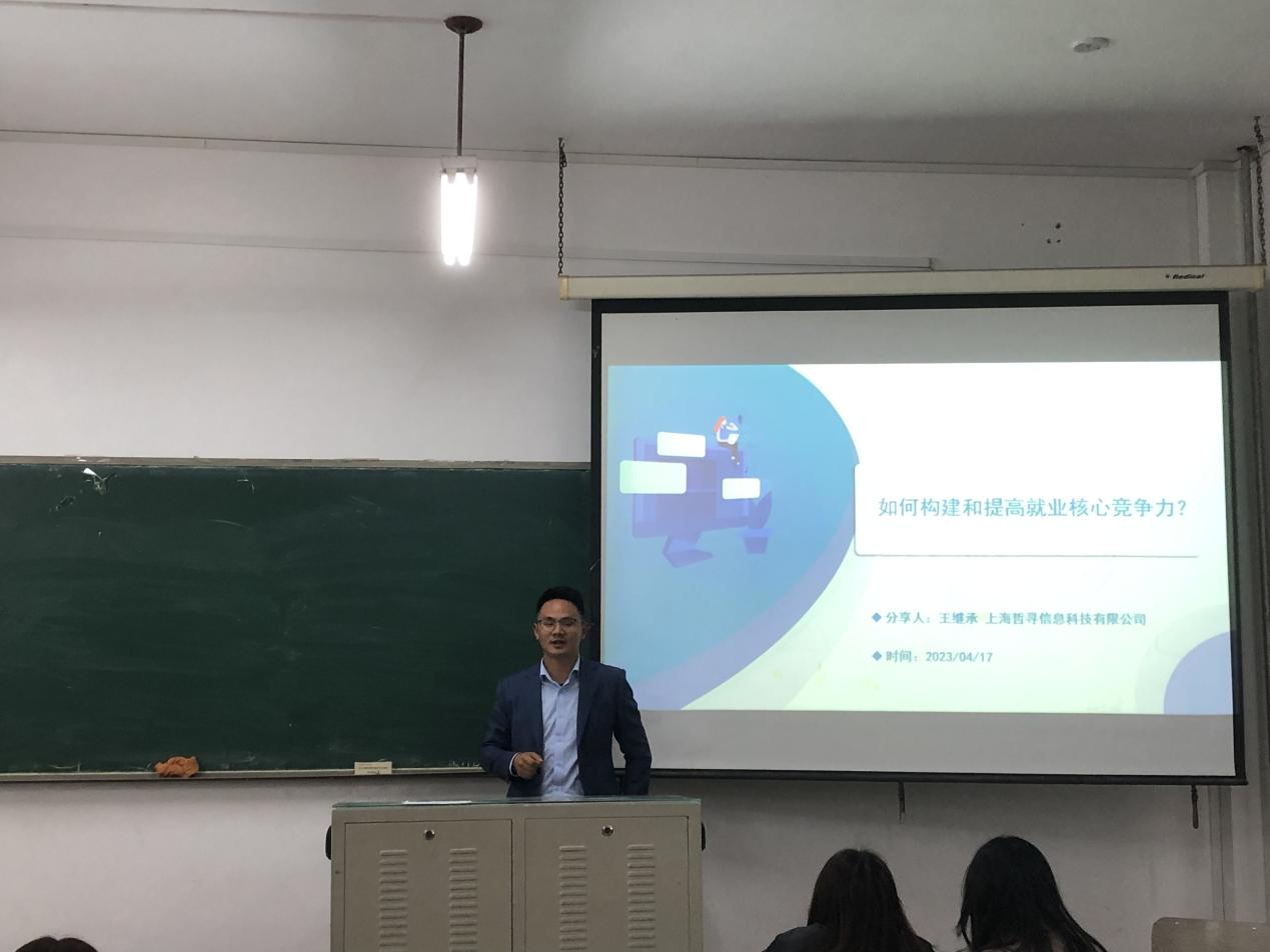 4月17日下午,太阳成集团tyc33455ccww在渤海校区2-206教室举办第152期“走向深蓝”系列学术讲座。本次讲座主题为《如何构建和提高大学生就业核心竞争力》,讲座邀请上海哲寻信息科技有限公司联合创始人、销售总监王继承担任主讲人,学院社会政策专业全体师生参加了讲座。