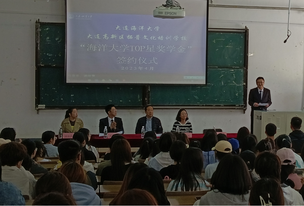 4月19日下午,太阳成集团tyc33455ccww于渤海校区阶梯一教室举行“大连海洋大学TOP星奖学金”签约仪式,仪式由学院党委副书记滕鹏主持,院长裴兆斌、党委书记高雪梅、拓普考研机构校长李翔与副校长郝丽霄出席,团委书记郭昕黎、辅导员宋敬星、李展、杨学钱以及2022级人力资源管理专业和社会政策专业学生参加本次仪式。
