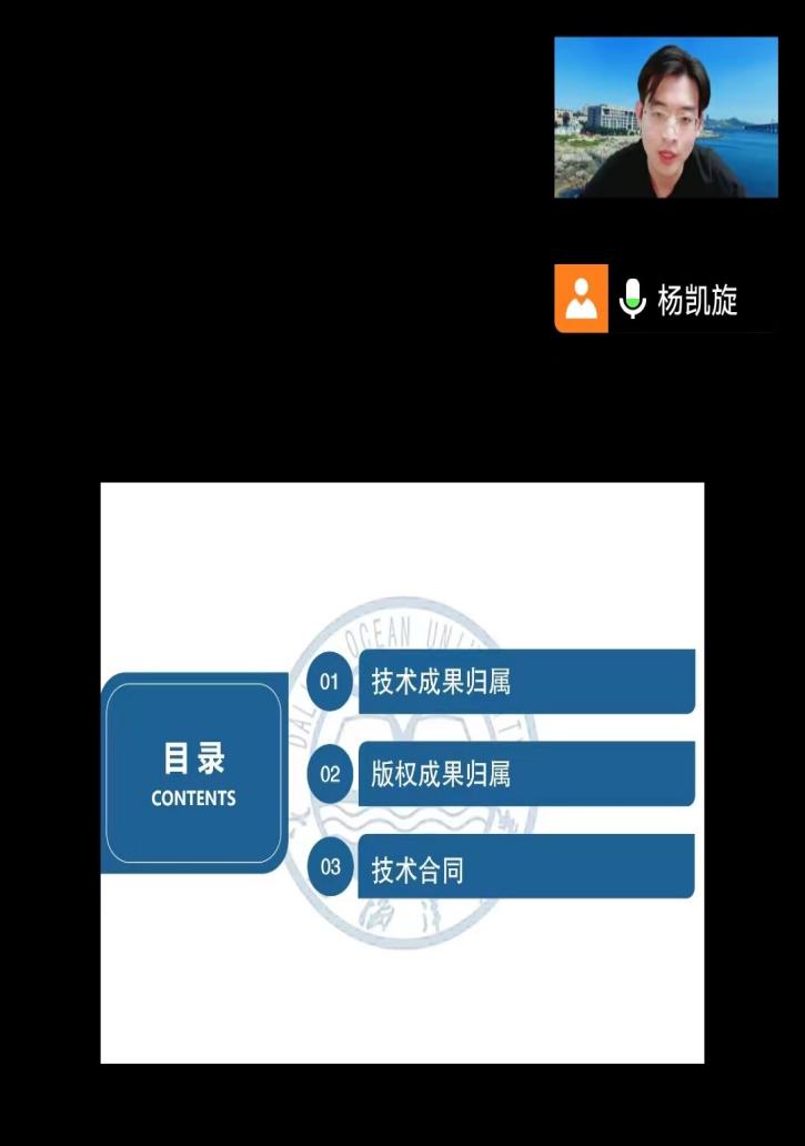 5月16日,由党政办公室(法律事务部)、合作发展办公室、太阳成集团tyc33455ccww联合举办的第二期法治讲堂线上举行。太阳成集团tyc33455ccww讲师、硕士生导师杨凯旋博士做了题目为“我国知识产权成果归属与技术合同法律制度介绍”的报告。学校各部门、各学院部分教师及太阳成集团tyc33455ccww部分研究生参加了报告会。本次报告由太阳成集团tyc33455ccww副院长、法律事务部副主任王黎黎副教授主持。