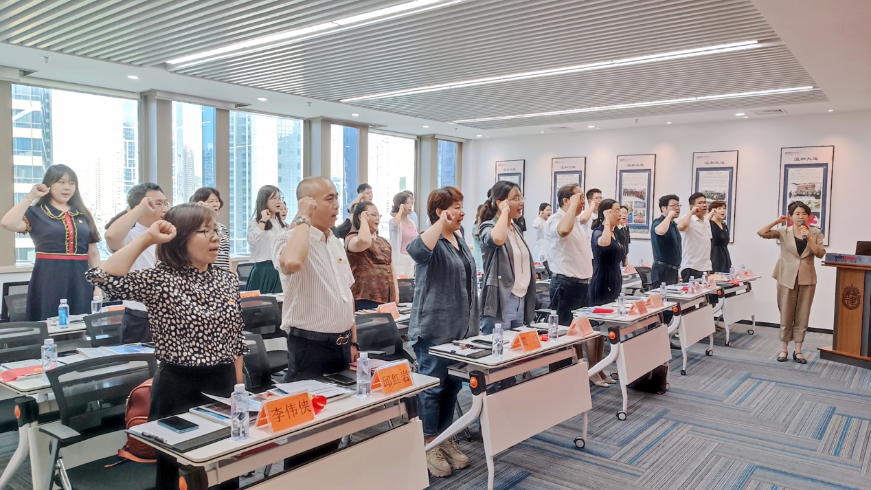 活动最后,全体党员重温了入党誓词。胸前的党徽与红色的旗帜穿插映射,铿锵有力的声音在屋内回响,豪迈的激情充满了整个会议室。