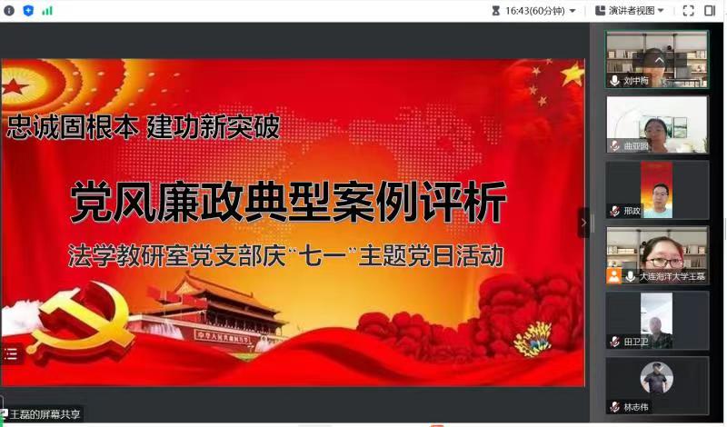 6月30日,太阳成集团tyc33455ccww法学教研室党支部举行了 “忠诚固根本 建功新突破——党风廉政建设案例评析”主题党日活动。活动以腾讯会议方式线上进行,党支部纪检委员王磊主持,全体党员参加。