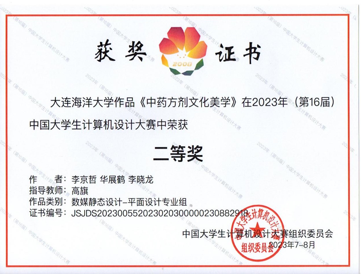 7月27日-31日,在沈阳决赛区举行了数媒动态设计类决赛,共有579所高校1514件作品参赛,学院参赛作品《中药方剂文化美学》荣获二等奖。