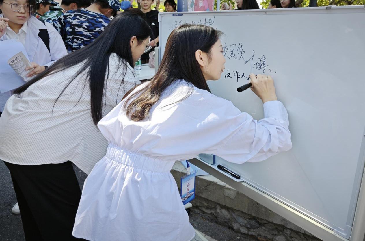 本次校内“反诈”宣传主题为“你我同心、反诈同行”,活动围绕提高学生的“反诈”意识和“反诈”能力,开展了发放宣传单、有奖答题、主题签名以及校园随机采访等活动。
