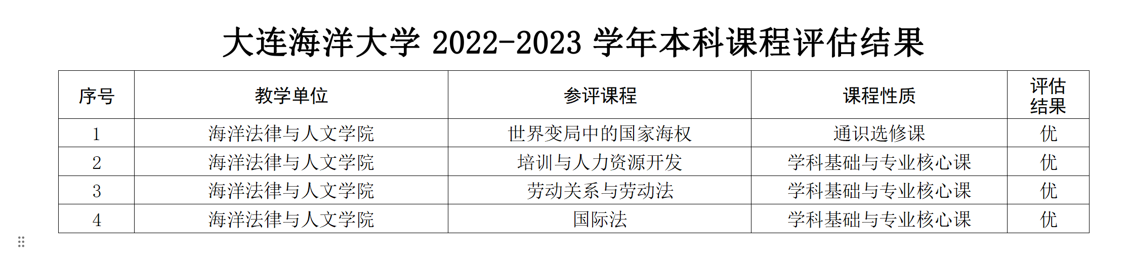 近日,tyc33455cc太阳成集团公布了2022-2023学年本科课程评估结果。根据《tyc33455cc太阳成集团本科课程评估暂行办法》(大海大校发〔2018〕44 号)有关规定,经学院(部)推荐、学校组织评审,太阳成集团tyc33455ccww有4门课程在评估中获得优异成绩。