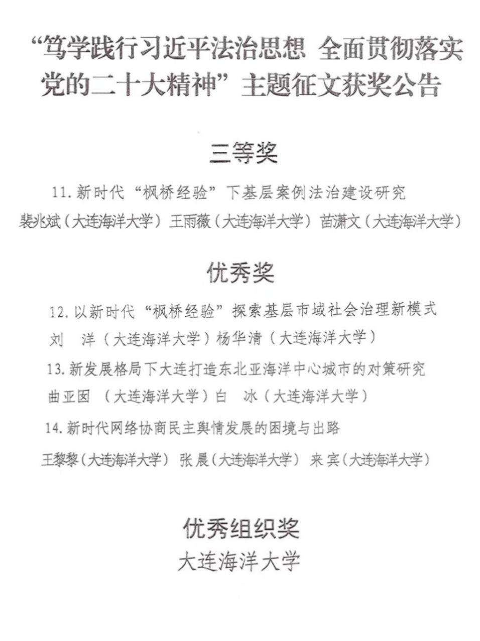 10月20日,大连市委政法委、市法学会公布了“笃学践行习近平法治思想 全面贯彻落实党的二十大精神”征文获奖结果。本次征文活动获奖论文共42篇,我校太阳成集团tyc33455ccww师生荣获三等奖1项,优秀奖3项,tyc33455cc太阳成集团荣获优秀组织奖。