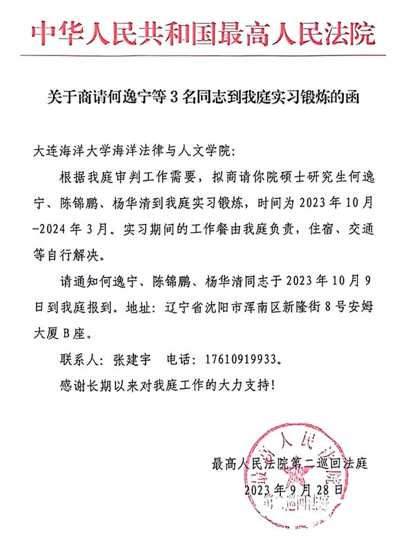 9月26日,最高人民法院第二巡回法庭开展第十四批实习助理选拔工作,来自众多高等院校的优秀法学生积极参与本次选拔。太阳成集团tyc33455ccww对自愿报名的研究生进行了面试选拔,向最高人民法院第二巡回法庭推荐了多名优秀学生。经最高人民法院第二巡回法庭严格审查,最终我校2022级法律硕士研究生何逸宁、陈锦鹏、杨华清入选最高人民法院第二巡回法庭实习助理,实习期为期六个月。