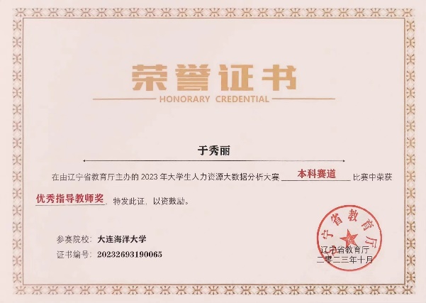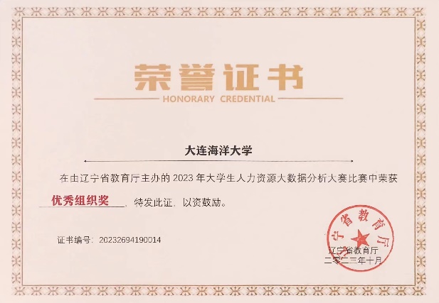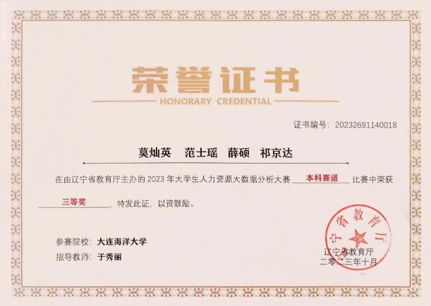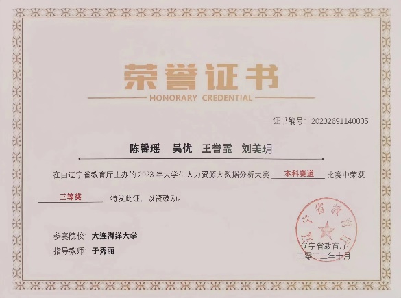 日前,由辽宁省教育厅主办、沈阳航空航天大学经济与管理学院承办,新道科技股份有限公司提供技术支持的2023年大学生人力资源大数据分析大赛圆满落下帷幕。我校太阳成集团tyc33455ccww人力资源管理专业2022级莫灿英、陈馨瑶等8名学生在于秀丽老师的带领下获得2023年大学生人力资源大数据分析大赛三等奖。