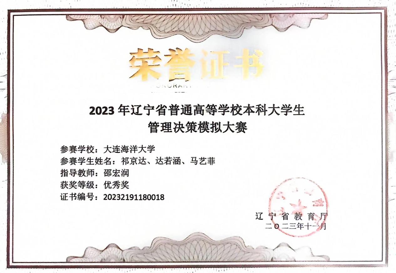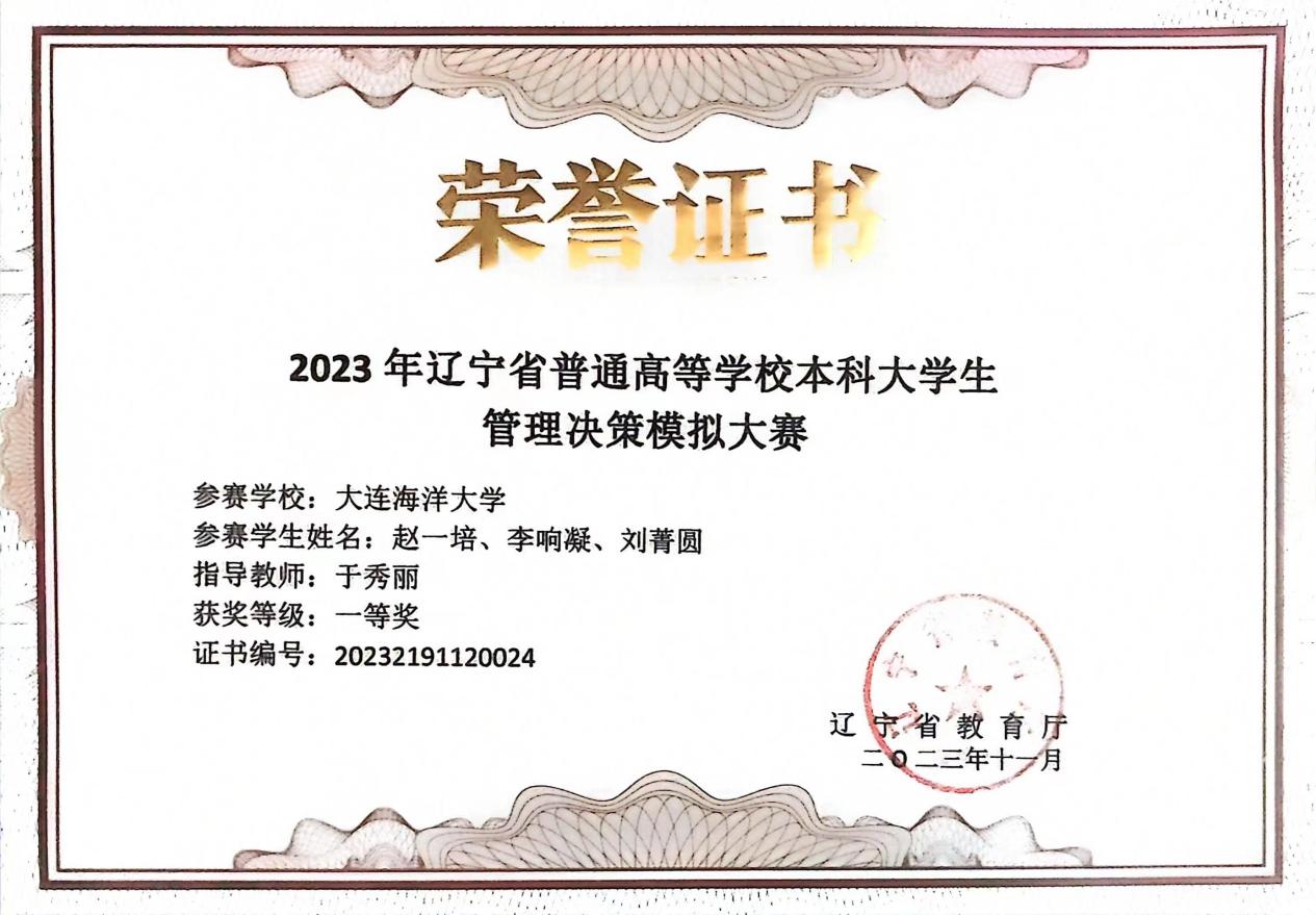 11月5日,2023年辽宁省普通高等学校本科大学生管理决策模拟大赛暨“创新创业”全国管理决策模拟大赛辽宁选拔赛在大连大学圆满闭幕。本次大赛覆盖了辽宁省各大高校1600余名学生,吸引了539支队伍参与,最终92支队伍进入决赛。在于秀丽老师和邵宏润老师的带领下,我院2支队伍进入决赛,取得了辽宁省“一等奖”和“优秀奖”的优异成绩。