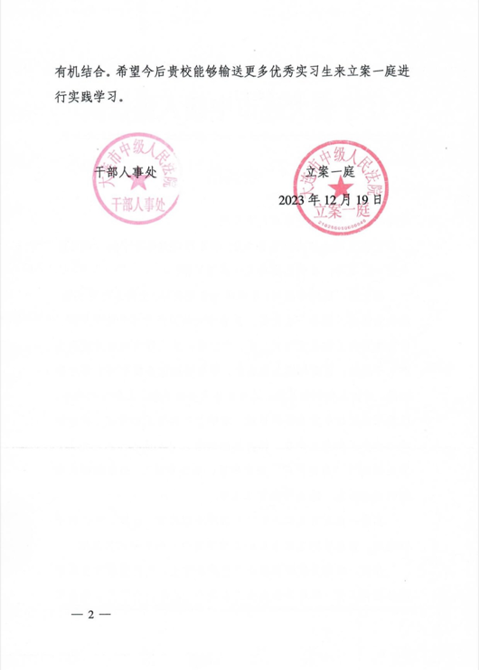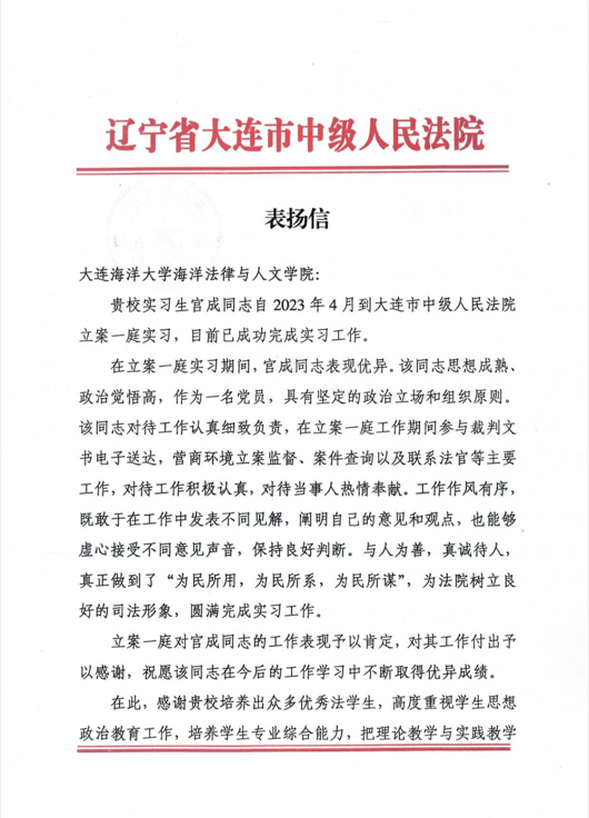 大连市中级人民法院对这两名实习生的表现提出表扬,并感谢学校培养出众多优秀法学生。