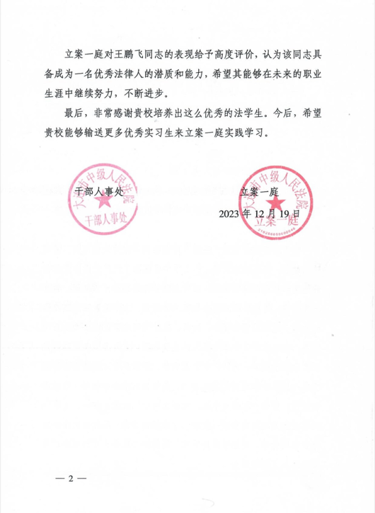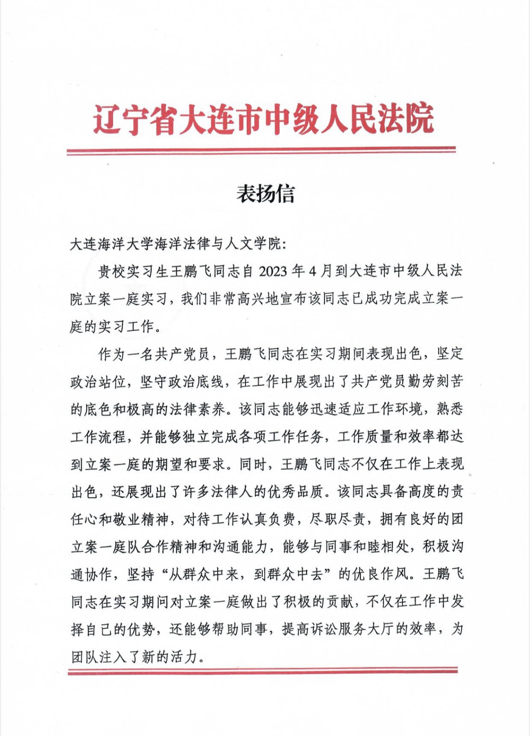 近日,太阳成集团tyc33455ccww收到大连市中级人民法院发来的两封表扬信,对学院2021级法律硕士研究生王鹏飞、宫成在大连市中级人民法院实习期间的工作表现提出表扬。