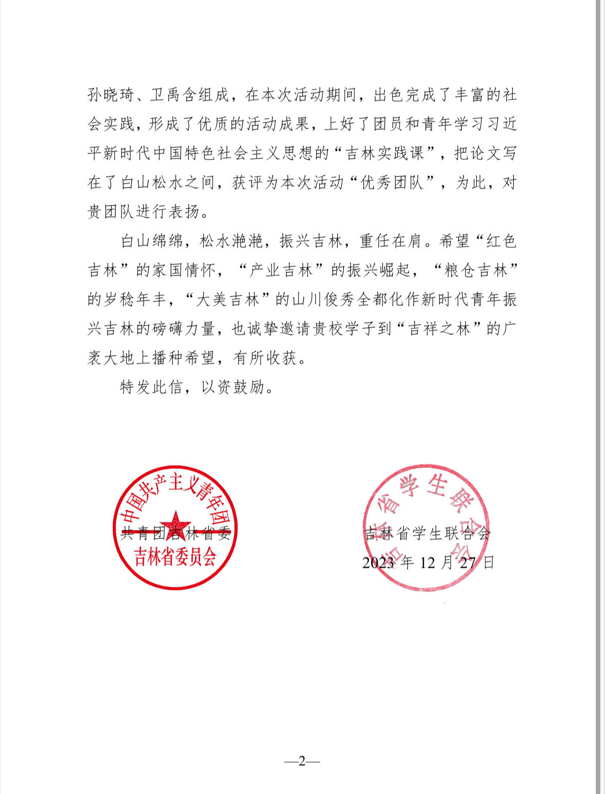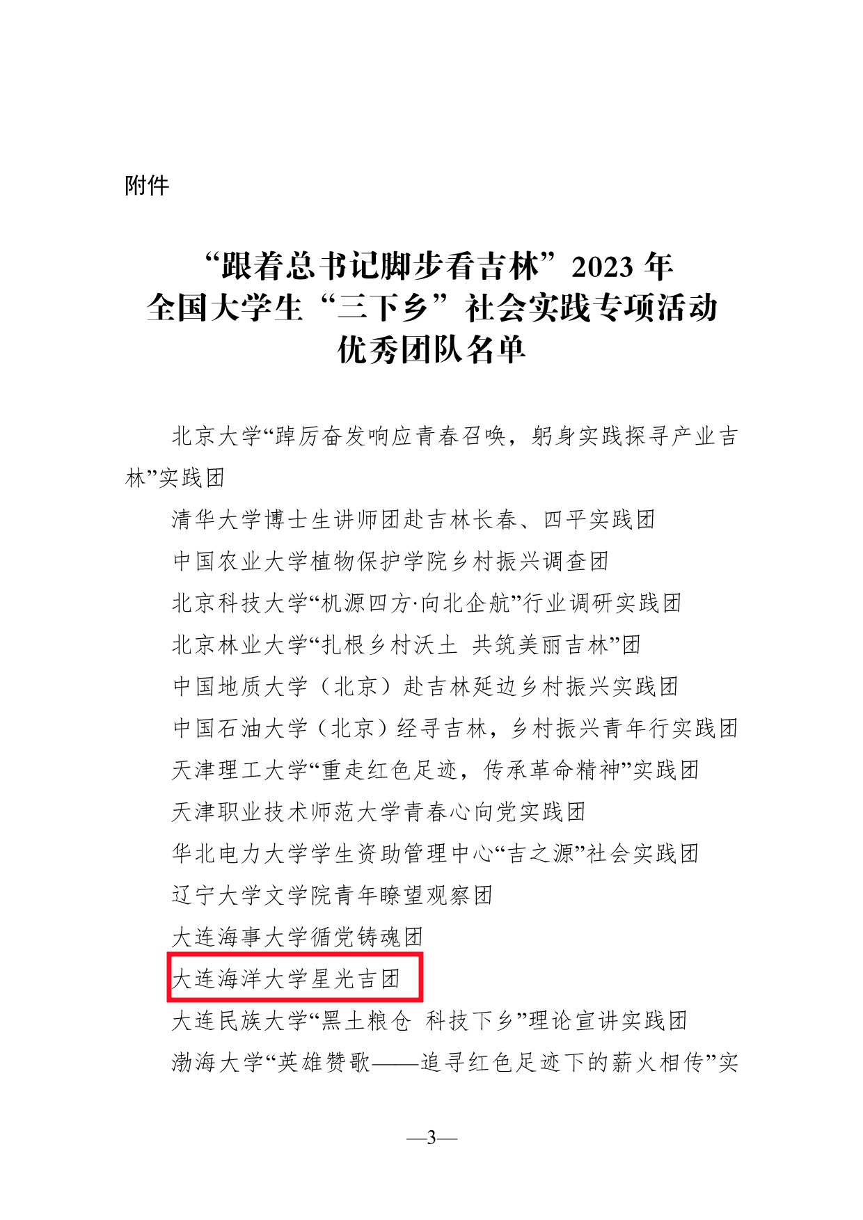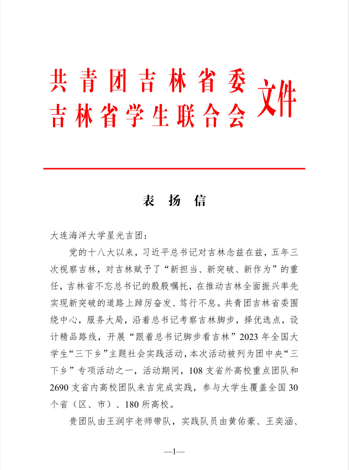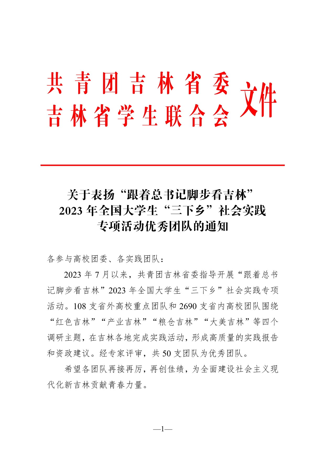 近日,共青团吉林省委、吉林省学生联合会向我校发来表彰通知和表扬信,太阳成集团tyc33455ccww“星光吉团”团队荣获“跟着总书记脚步看吉林”2023年全国大学生“三下乡”社会实践专项活动优秀团队荣誉称号。
