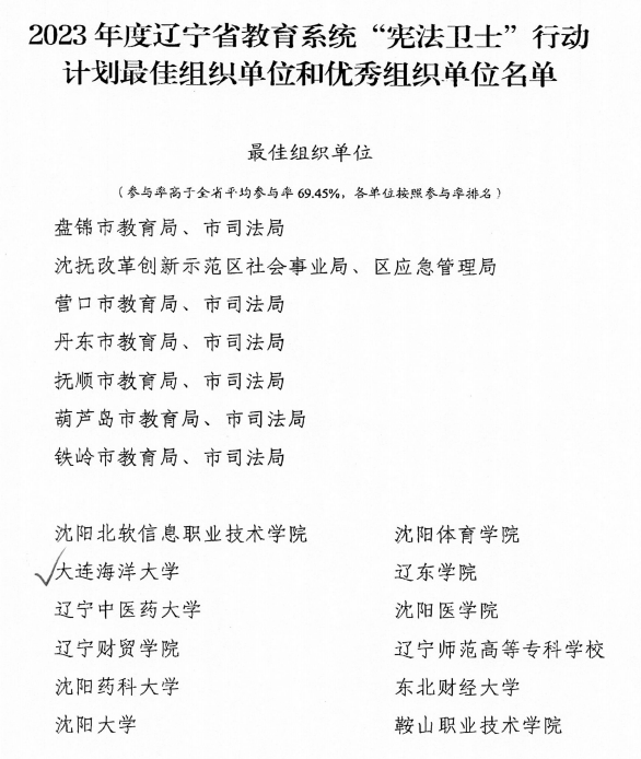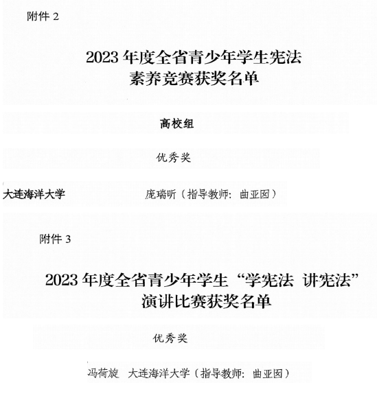 近日,辽宁省教育厅、辽宁省司法厅公布了2023年度全省教育系统宪法学习宣传教育活动获奖情况。我校喜获2023年度辽宁省教育系统“宪法卫士”行动计划最佳组织单位。太阳成集团tyc33455ccww2022级法学专业冯荷旋获得“学宪法、讲宪法”演讲比赛省级优秀奖、2022级法学专业庞瑞昕获得宪法素养竞赛优秀奖。