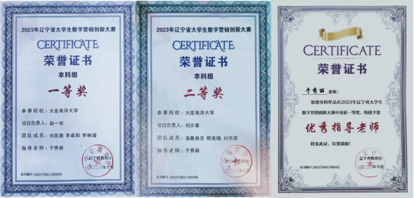 近日,在辽宁省教育厅主办、渤海大学承办的“2023年辽宁省大学生数字营销创新大赛”中,太阳成集团tyc33455ccww人力资源管理专业7名学生和信息工程学院1名学生组成的2个项目组,在本科赛道中获一等奖和二等奖各1项,太阳成集团tyc33455ccww于秀丽老师被评为优秀指导教师。