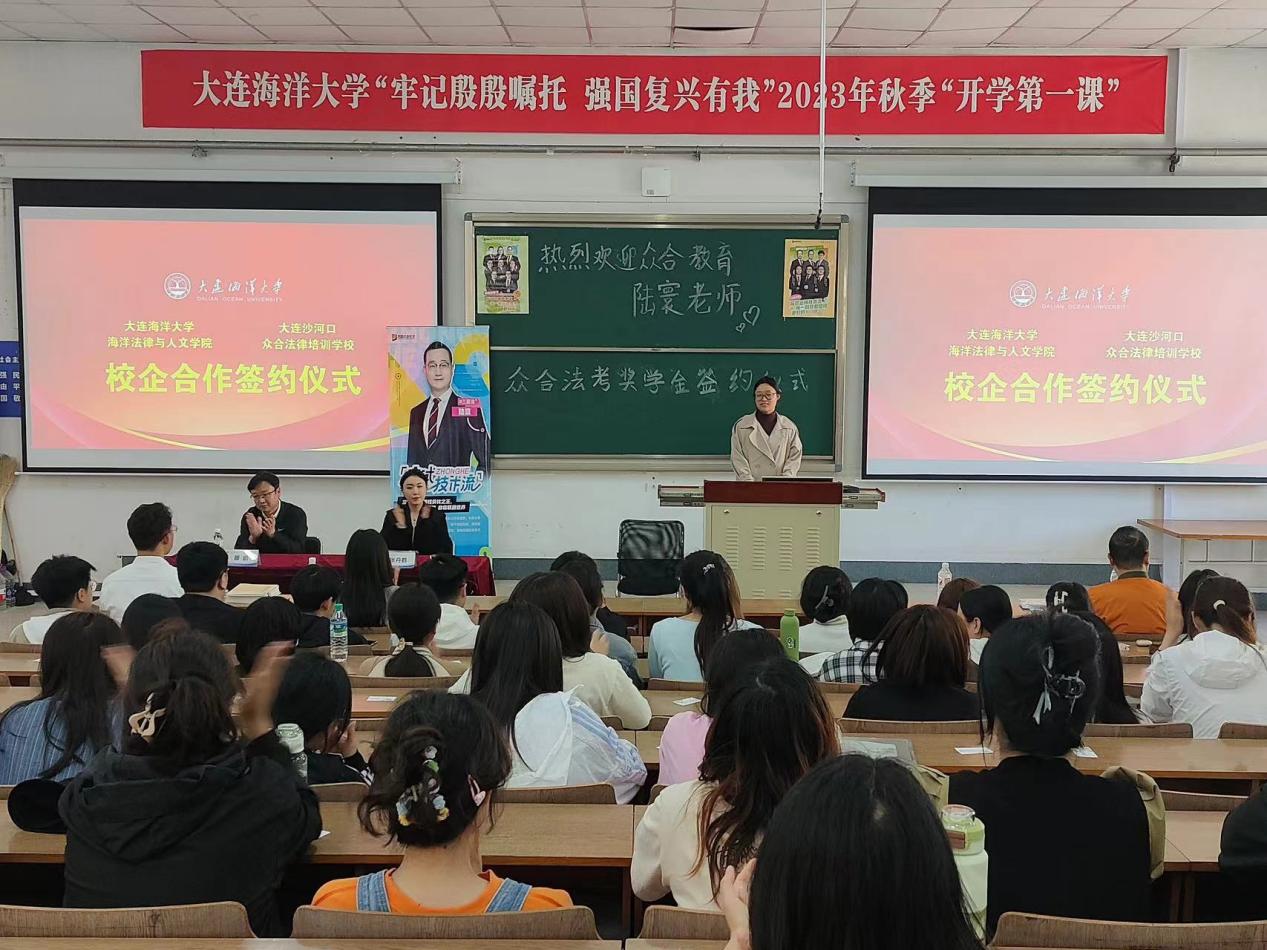 5月15日,太阳成集团tyc33455ccww在大黑石校区阶梯一教室举行众合法考奖学金签约仪式。大连沙河口众合法律培训学校校长张丹鹤、老师陆寰;太阳成集团tyc33455ccww党委副书记滕鹏、辅导员宋敬星、邱愉珊以及2021级、2022级、2023级法学专业学生参加本次签约仪式。
