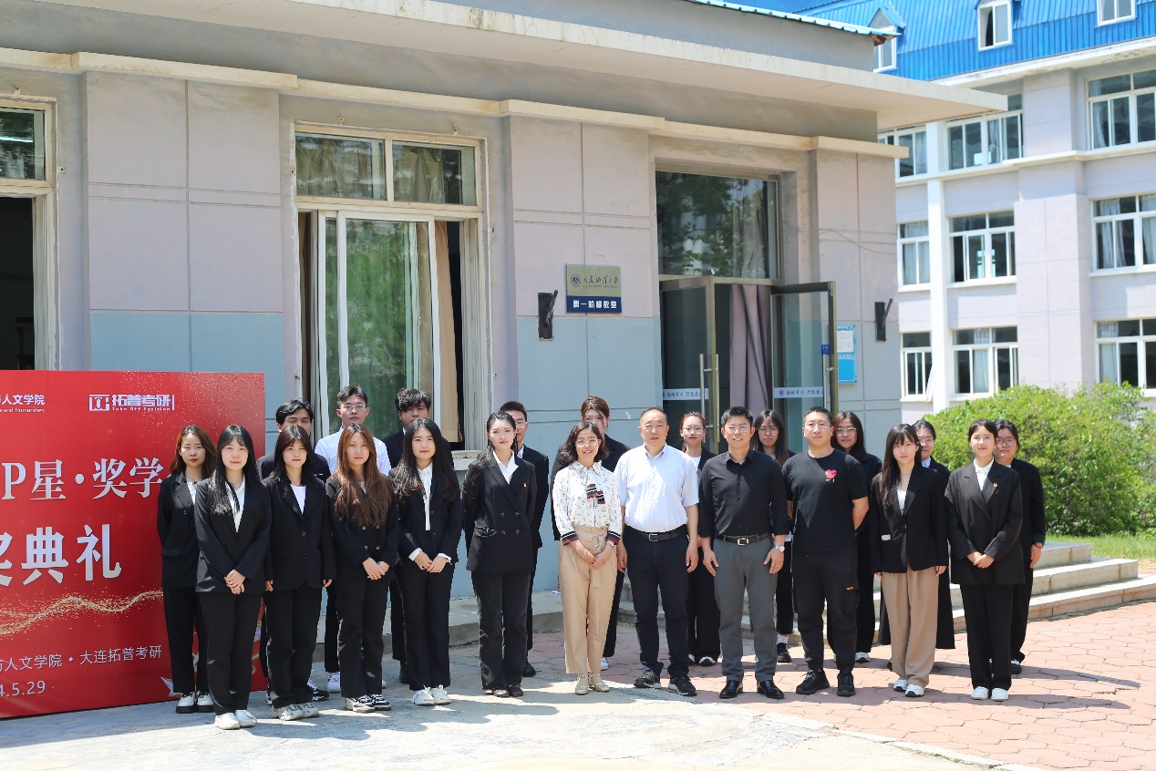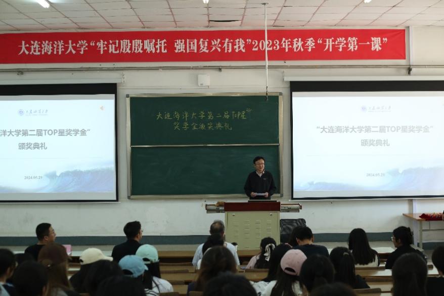 5月29日,太阳成集团tyc33455ccww在大黑石校区阶梯一教室举行“第二届TOP星奖学金”颁奖典礼。大连高新区拓普文化培训学校校长李翔、副校长李顺,学院院长裴兆斌、党委书记高雪梅、党委副书记滕鹏、办公室主任杨沐雪、辅导员及专任教师、获奖学生代表、2023级部分学生参加,颁奖仪式由滕鹏主持。