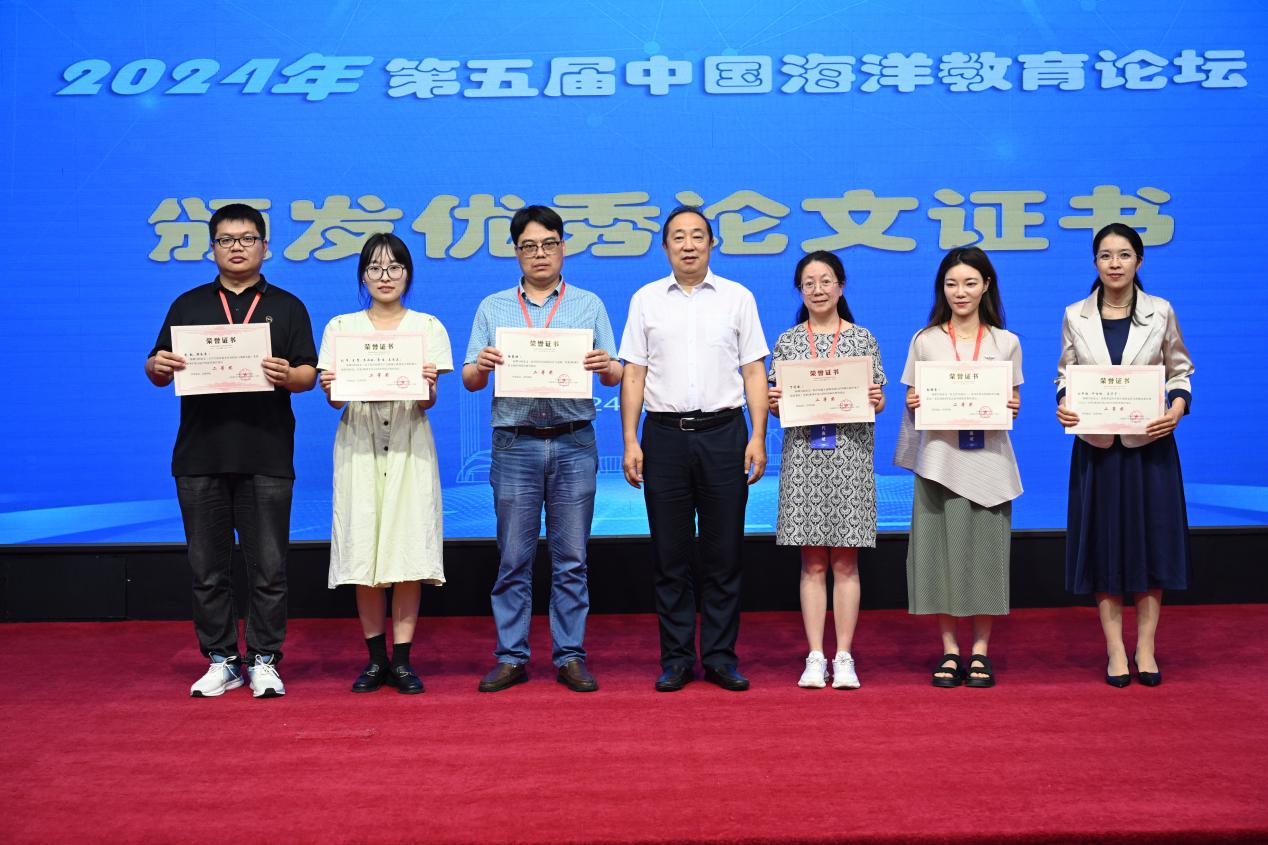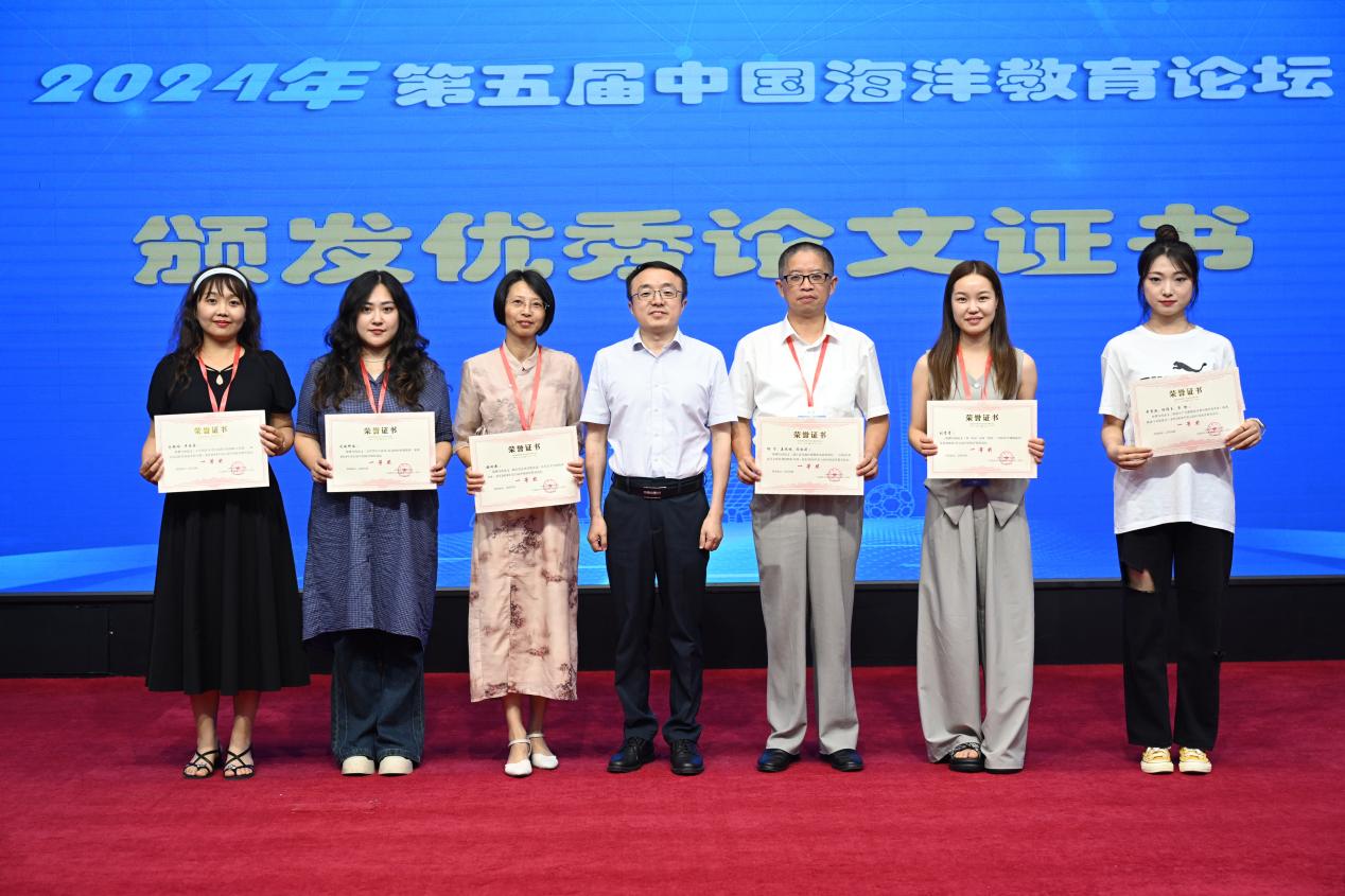 (全国海洋教育研究联盟常务副理事长、宁波大学刘训华教授为优秀论文教师组一等奖获得者颁奖)