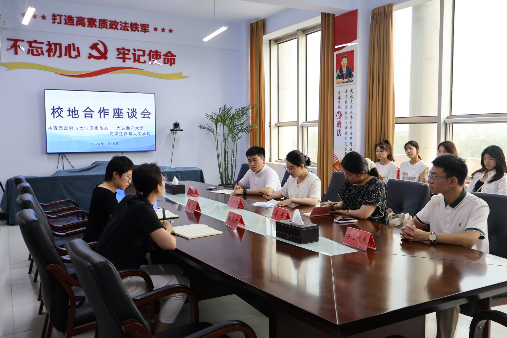 为进一步深化校地合作,搭建合作平台,完善校地协同育人模式,创新人才培养机制,7月15日,团队与共青团盘锦市大洼区委员会开展了校地合作工作座谈,学院团委书记郭昕黎,2022级本科生辅导员李展,共青团盘锦市大洼区委员会书记赵婷,共青团盘锦市大洼区委员会副书记陈天虹及学生代表参加了此次座谈。座谈会上,双方以创新和拓展普法形式为切入点,积极探索“协同育人”发展新路径,围绕人才需求、合作形式等内容进行了深入交流。