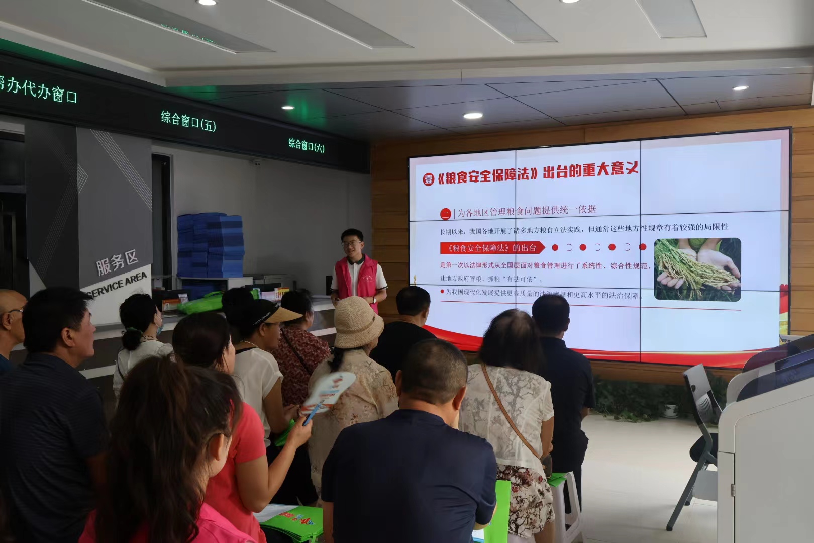 在社区活动室,团队成员向现场居民从粮食安全战略、粮食安全保障法治体系、粮食安全保障法法条解析、典型案例等方面,为社区居民深入浅出地讲解了粮食安全保障法的主要条款和出台的重要意义,大家边听、边记、边讨论,现场气氛热烈。