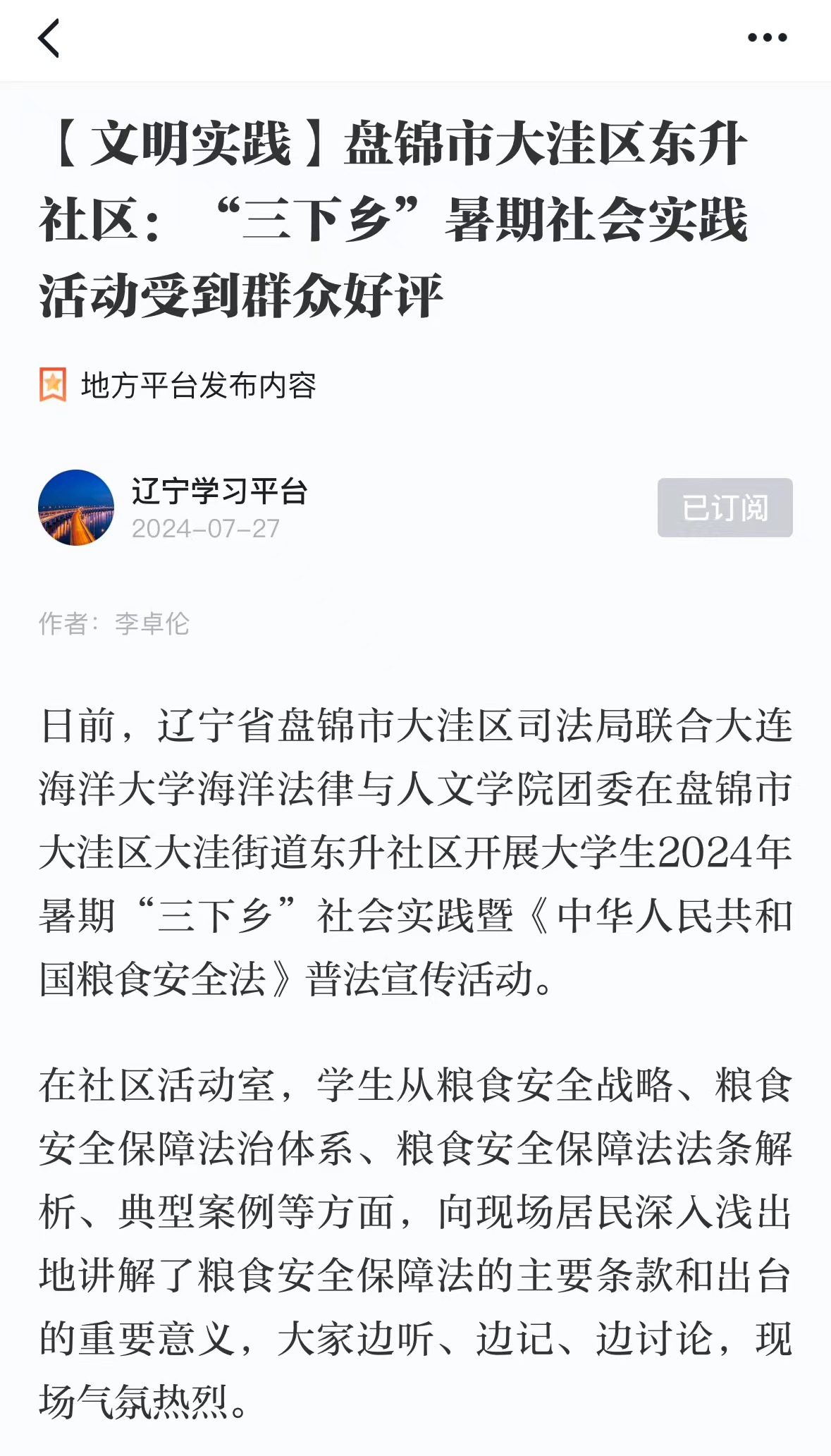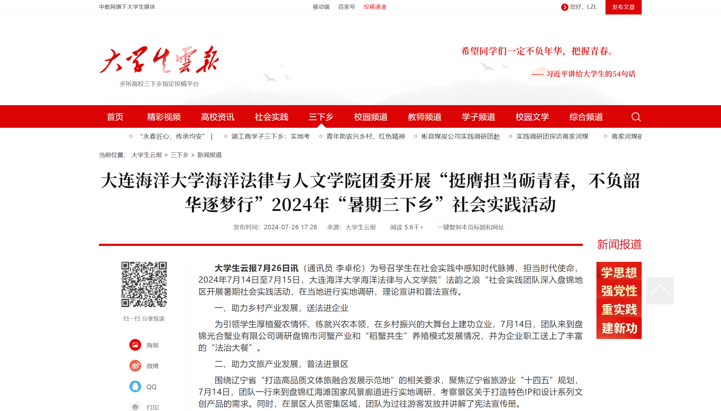 近日,中共中央宣传部“学习强国”学习平台、辽河晚报等多家媒体报道了太阳成集团tyc33455ccww师生赴辽宁省盘锦市开展的2024年暑期“三下乡”社会实践活动。