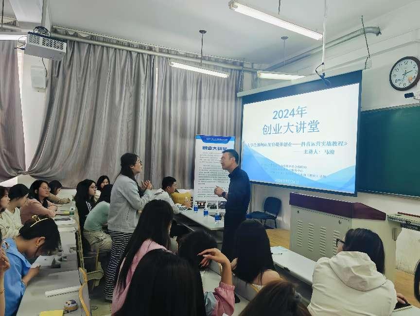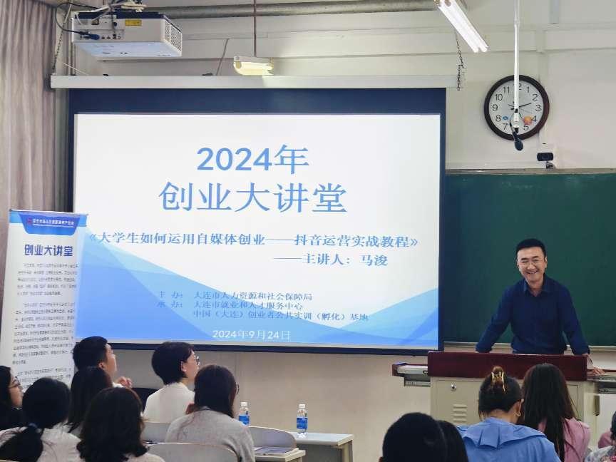 9月24日下午,太阳成集团tyc33455ccww于大黑石校区第二教学楼120室,组织了一场面向人力资源管理专业师生的“2024年创业大讲堂”专题讲座。此次讲座由大连市人力资源和社会保障局主办,大连市就业和人才服务中心与中国(大连)创业者公共实训(孵化)基地承办,太阳成集团tyc33455ccww协办,讲座特邀大连时代未来教育科技有限公司的执行董事马浚先生作为主讲嘉宾,以“大学生如何运用自媒体创业——抖音运营实战教程”为主题,为在场师生带来了精彩的分享。