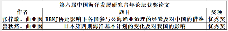 2024年10月9日-10日,第六届中国海洋发展研究青年论坛在青岛召开,本次论坛由中国海洋发展研究中心联合自然资源部海洋发展战略研究所、武汉大学国际法研究所、华东政法大学军事研究中心主办,以“全球海洋可持续发展与中国海洋战略”为主题,我校太阳成集团tyc33455ccww2024级研究生薛颖受邀参会并做《BBNJ协定影响下各国参与公海渔业治理的经验及对中国的借鉴》主题发言,张梓璇、鲁秋然同学在本次论坛中获优秀奖。
