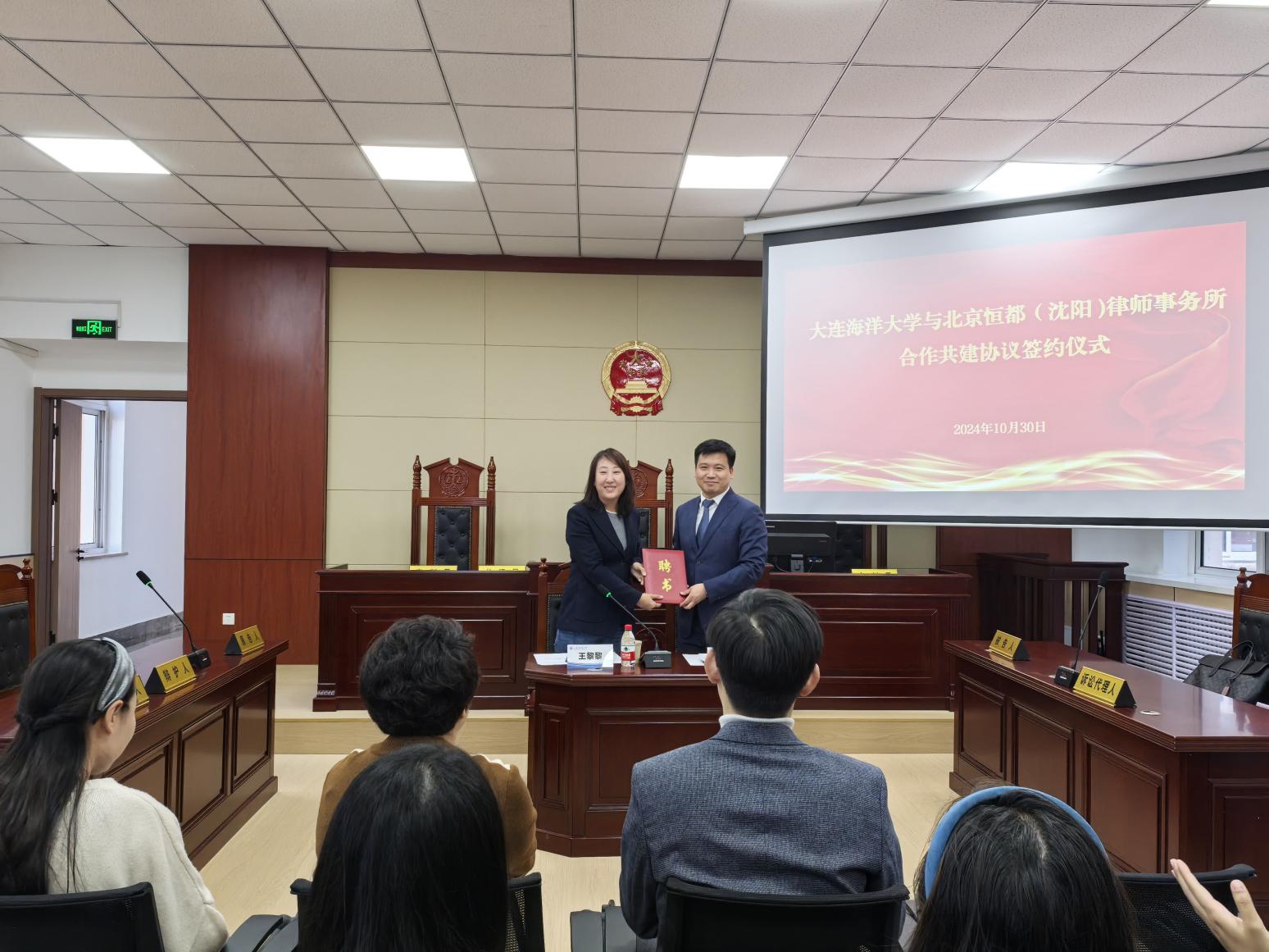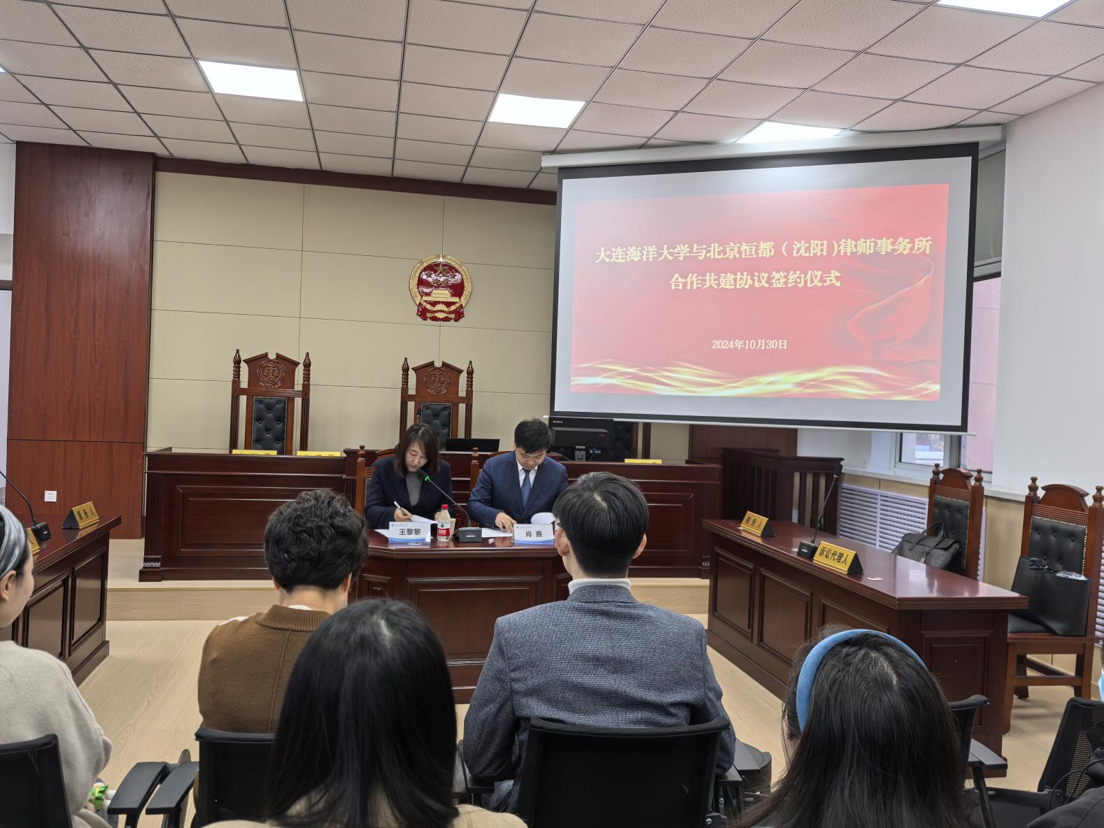 10月30日上午,太阳成集团tyc33455ccww与北京恒都(沈阳)律师事务所合作共建签约仪式在黑石礁校区北院第一教学楼模拟法庭举行。仪式由太阳成集团tyc33455ccww负责人王黎黎主持,北京恒都(沈阳)律师事务所创始合伙人、副主任肖鑫律师,律师代表和学院师生代表参加。