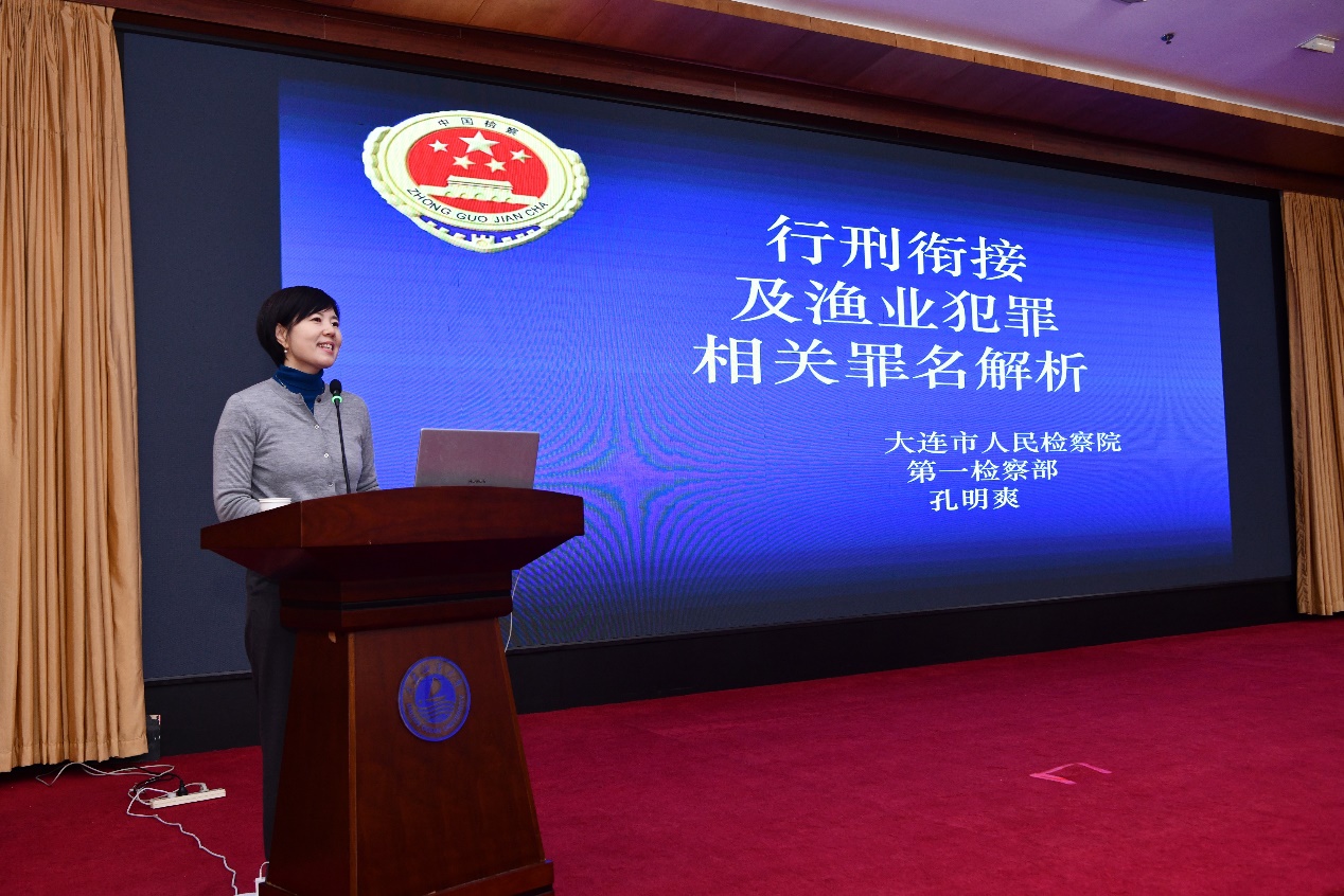 大连市人民检察院第一检察部孔明爽以《行刑衔接及渔业犯罪相关罪名解析》为题,结合实务工作经验,围绕行刑衔接的概念和内容、行刑衔接的相关规定和证据的衔接问题,与执法人员进行疑难问题沟通与交流,为渔业执法部门开展行刑衔接工作提供理论及案例支撑。