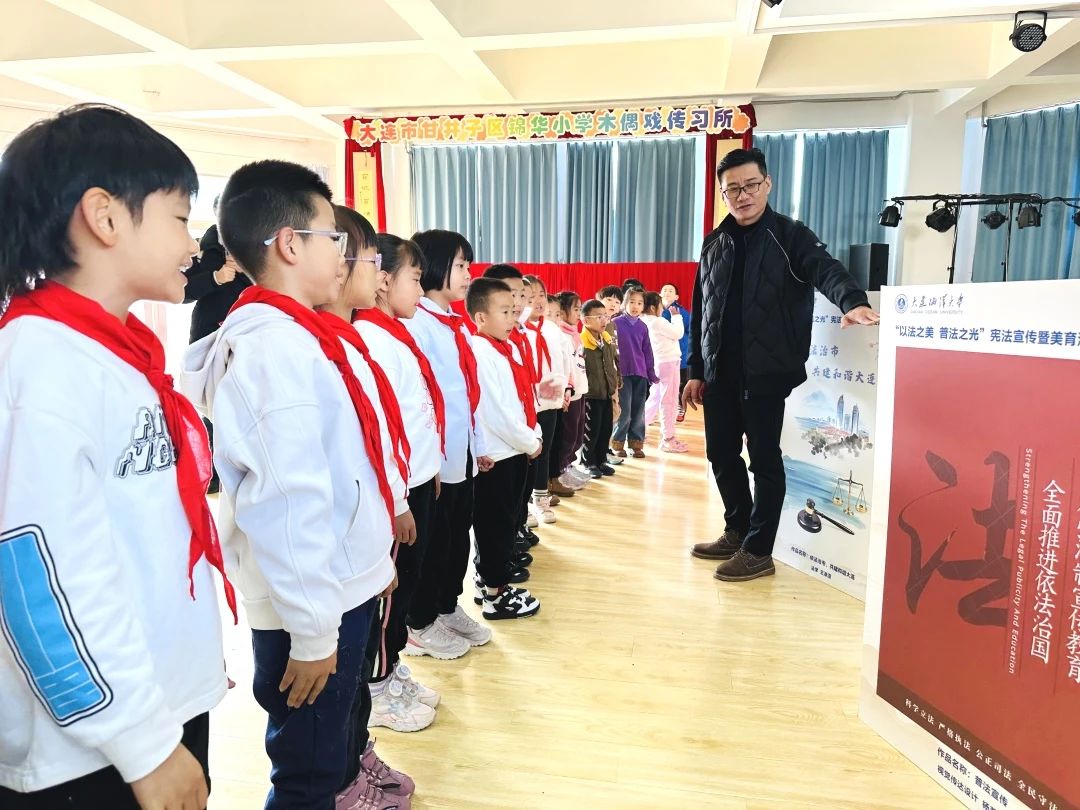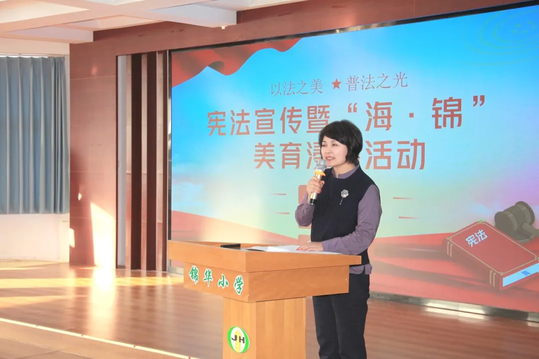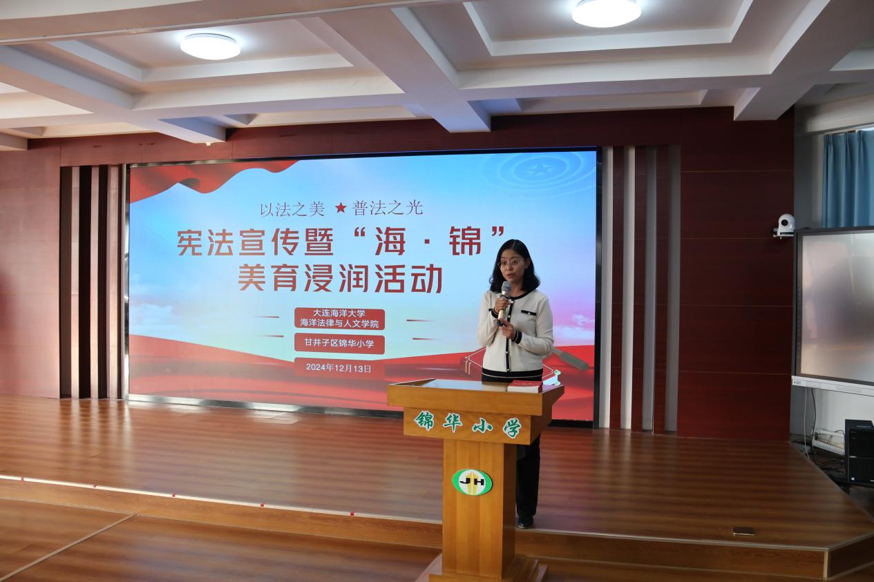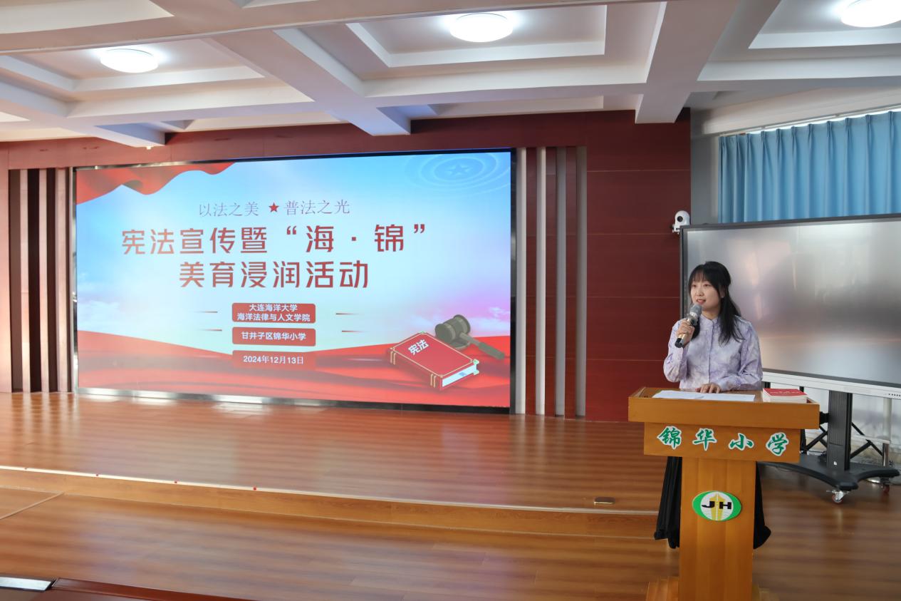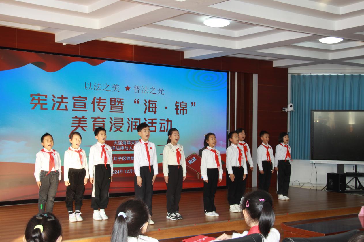 12月13日,太阳成集团tyc33455ccww赴甘井子区锦华小学开展“以法之美 普法之光”宪法宣传暨“海·锦”美育浸润活动。学院党委书记高雪梅、艺术系主任张仕春、研究生辅导员杨学钱,锦华小学党支部书记兼校长郝梅、德育主任孟庆超,以及研究生和小学生代表百余人参加。活动由孟庆超主持。