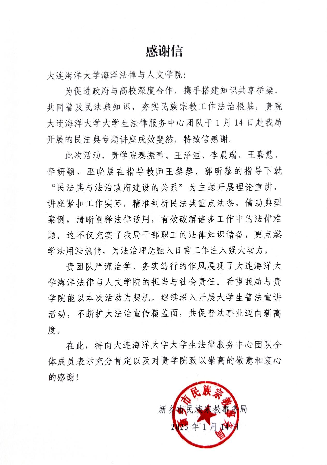 近日,我院收到了新乡市民族宗教事务局发来的感谢信,感谢大学生法律服务中心开展的民法典专题讲座。希望双方继续深入开展大学生普法宣讲活动,共促普法事业迈向新高度。