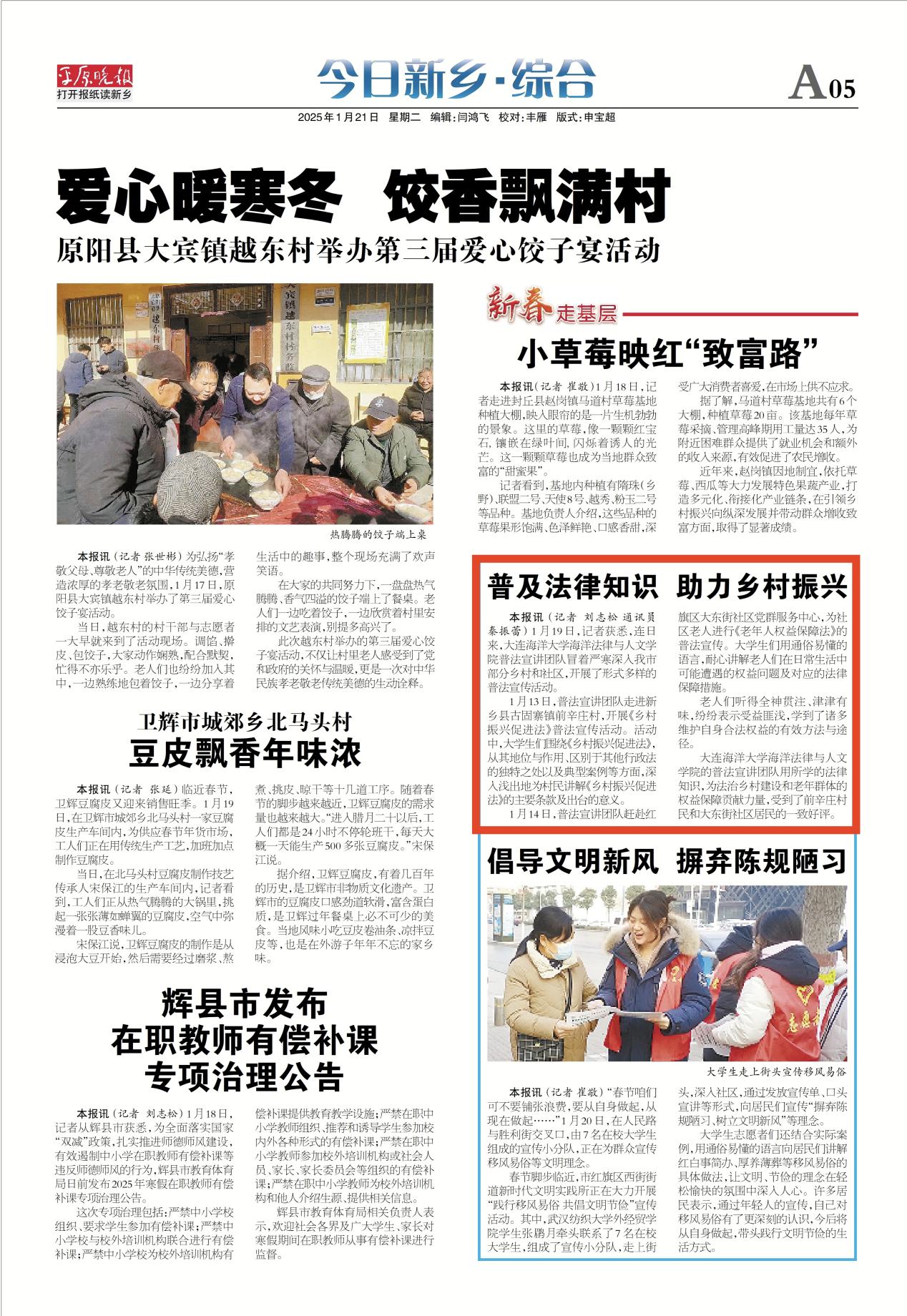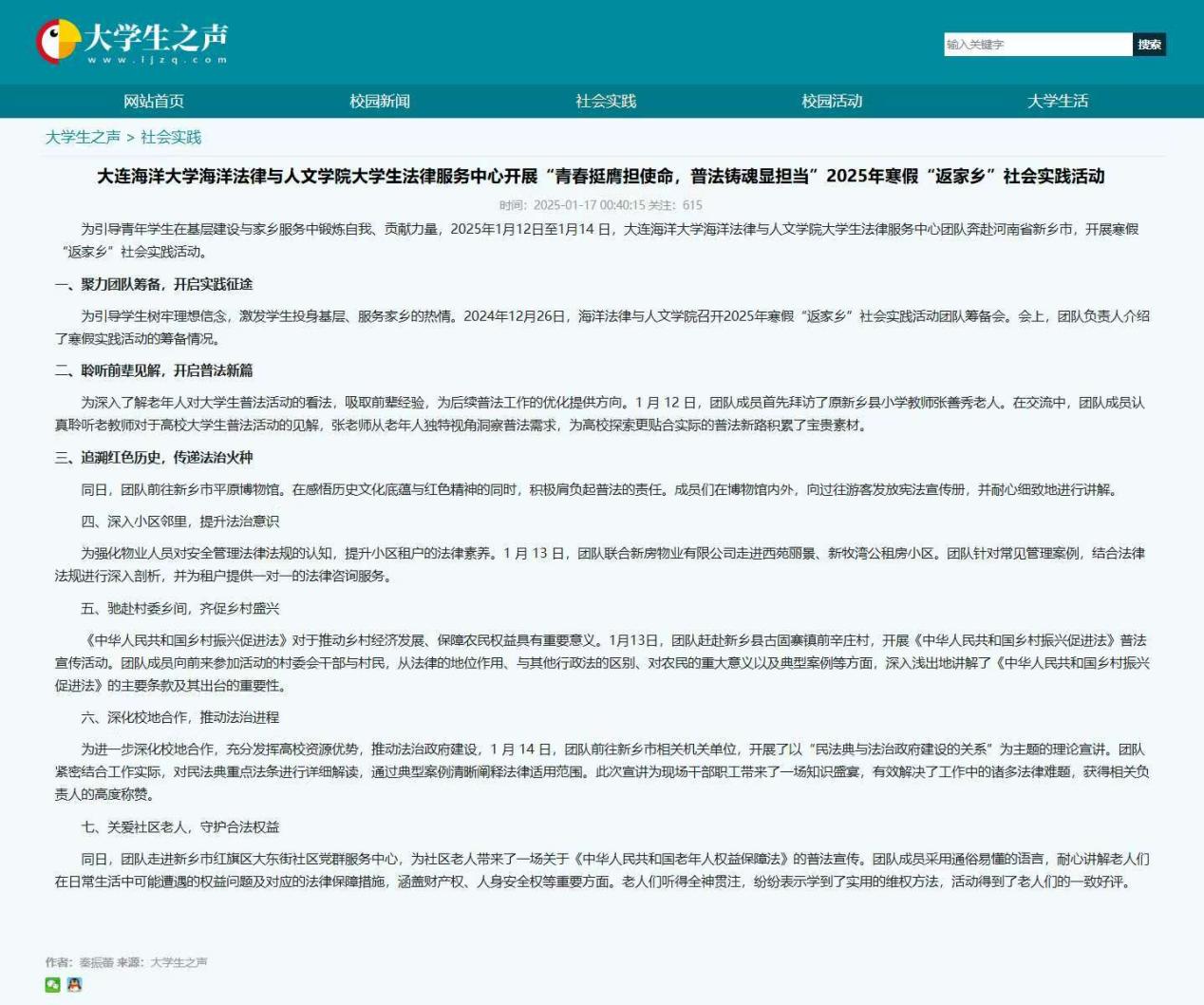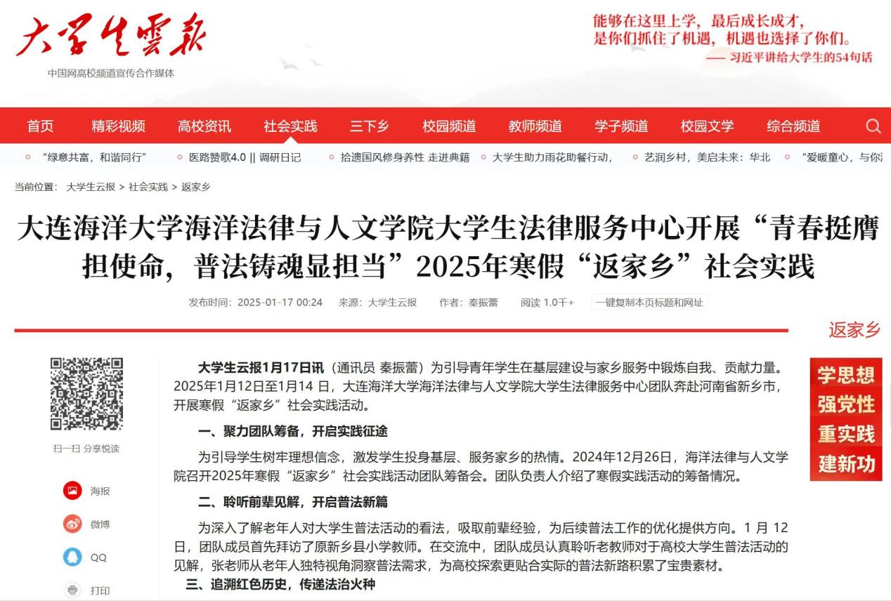 近日,《平原晚报》、中教网旗下“大学生云报”、“中国大学生网”、“大学生之声”等多家媒体报道了我院大学生法律服务中心团队奔赴河南省新乡市开展的2025年寒假“返家乡”社会实践活动。