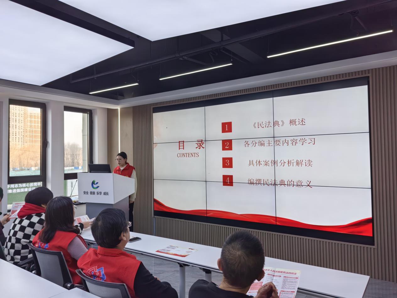 1月18日,宣讲团来到浑南区樾檀山社区党群服务中心,开展了民法典宣讲活动。宣讲团成员围绕民法典中与居民生活密切相关的内容,如婚姻家庭、继承、物权等进行了讲解,并解答了社区居民提出的法律问题。宣讲结束后,宣讲团成员参观了社区书房、影院、食堂和养老院,体验了“一站式、多功能、高品质”的新型社区,并传递了我院师生的温暖与关怀。