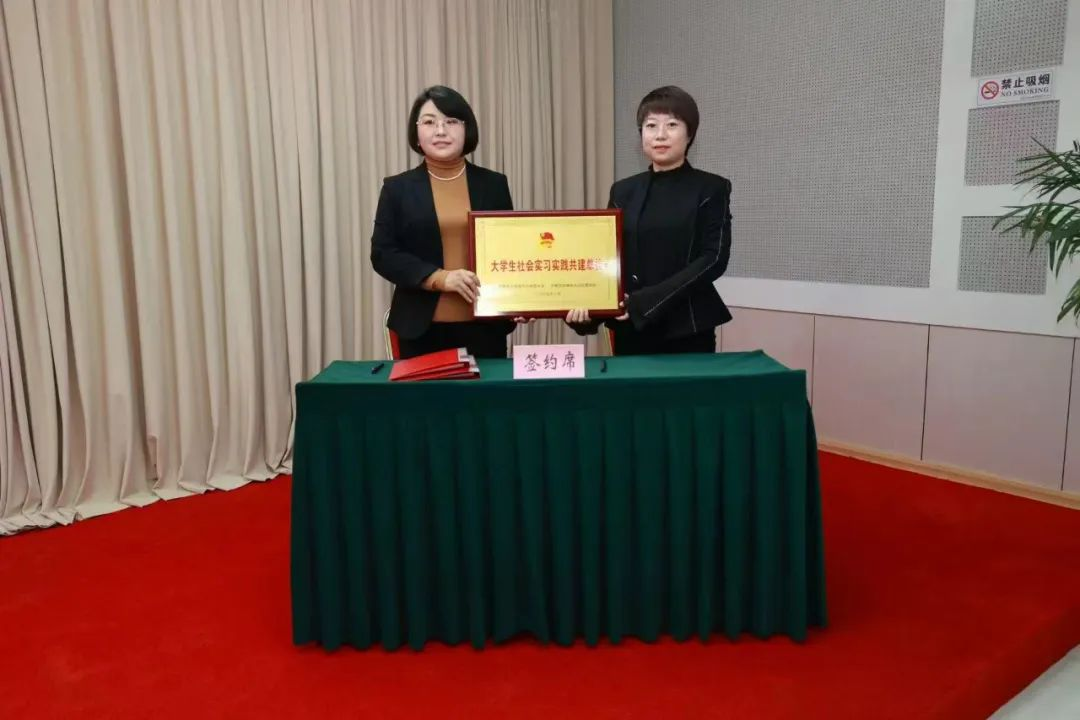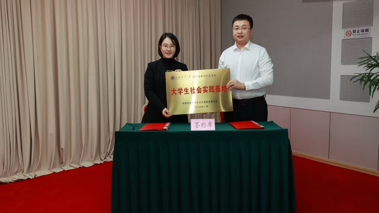 在2025年寒假盘锦市大洼区大学生实习“扬帆计划”启动仪式暨校地共建签约仪式上,张峰峡代表校团委与共青团盘锦市大洼区委员会签署了大学生社会实习实践共建单位协议,郭昕黎代表学院团委与共青团盘锦市大洼区唐家镇委员会签署大学生社会实践基地合作协议并为基地揭牌。
