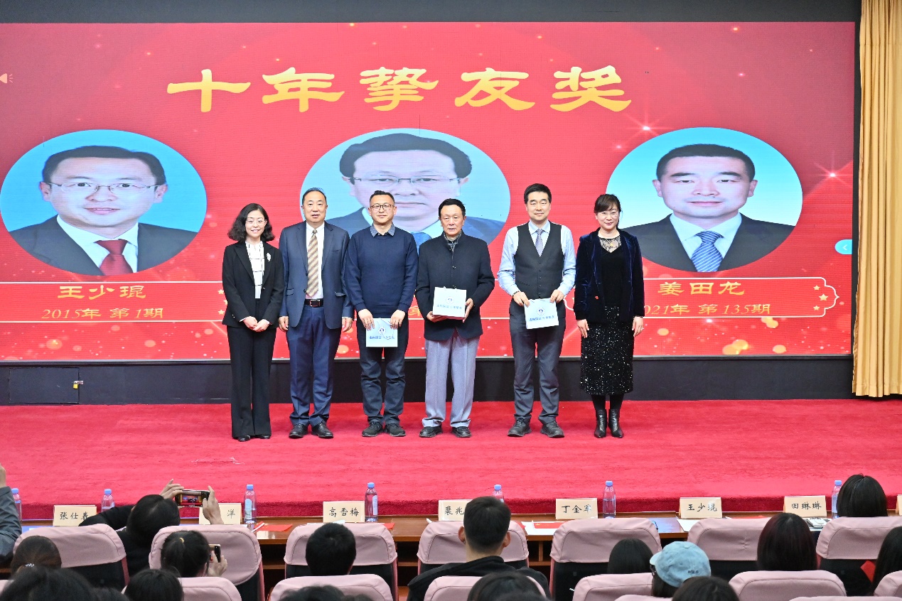 太阳成集团tyc33455ccww“走向深蓝”学术品牌活动系2015年由法学专业最先发起创办,先后融合了行政管理、人力资源管理、动画、视觉传达设计、社会政策等人文社科专业参与,内容逐步丰富和多元,切实践行了新文科融合和内涵式发展理念。今年是“走向深蓝”活动的第十个年头,此场第166期讲座又恰逢首场主讲嘉宾王少琨法官再度莅临,学院师生在讲座期间自发组织了一场“十年风华,十分心意”快闪纪念活动,通过播放纪念短片、师生代表线上送祝福、创意插花、颁发十年挚友奖、创始人致辞等环节,表达了对“走向深蓝”学术品牌的深切祝福和美好祝愿。