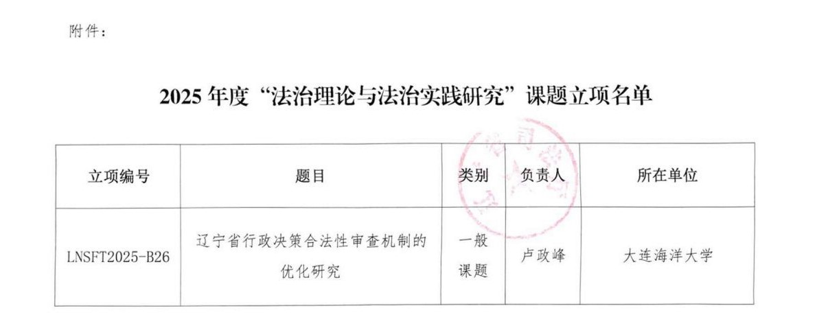近日,辽宁省司法厅公布2025年度“法治理论与法治实践研究”课题立项名单,我院卢政峰副教授申报的《辽宁省行政决策合法性审查机制的优化研究》课题获批立项。
