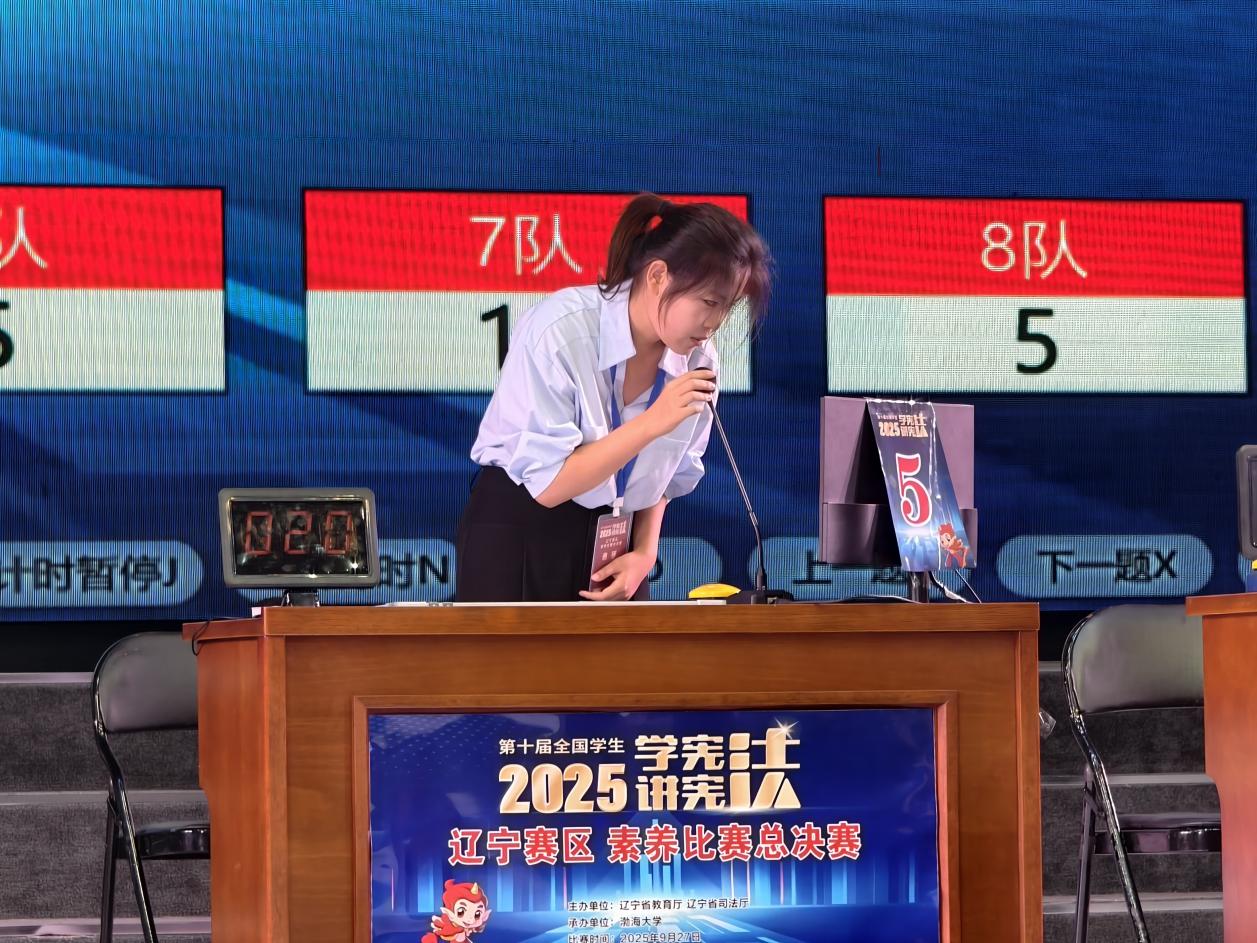 9月27日,由辽宁省教育厅、辽宁省司法厅联合主办的第十届全国学生“学宪法 讲宪法”活动辽宁赛区素养比赛总决赛在渤海大学举行。我院法学专业2024级赵紫嫣同学在通过线上笔试初赛后成功晋级省决赛,最终荣获三等奖。学院党委副书记滕鹏一同赴比赛现场指导。