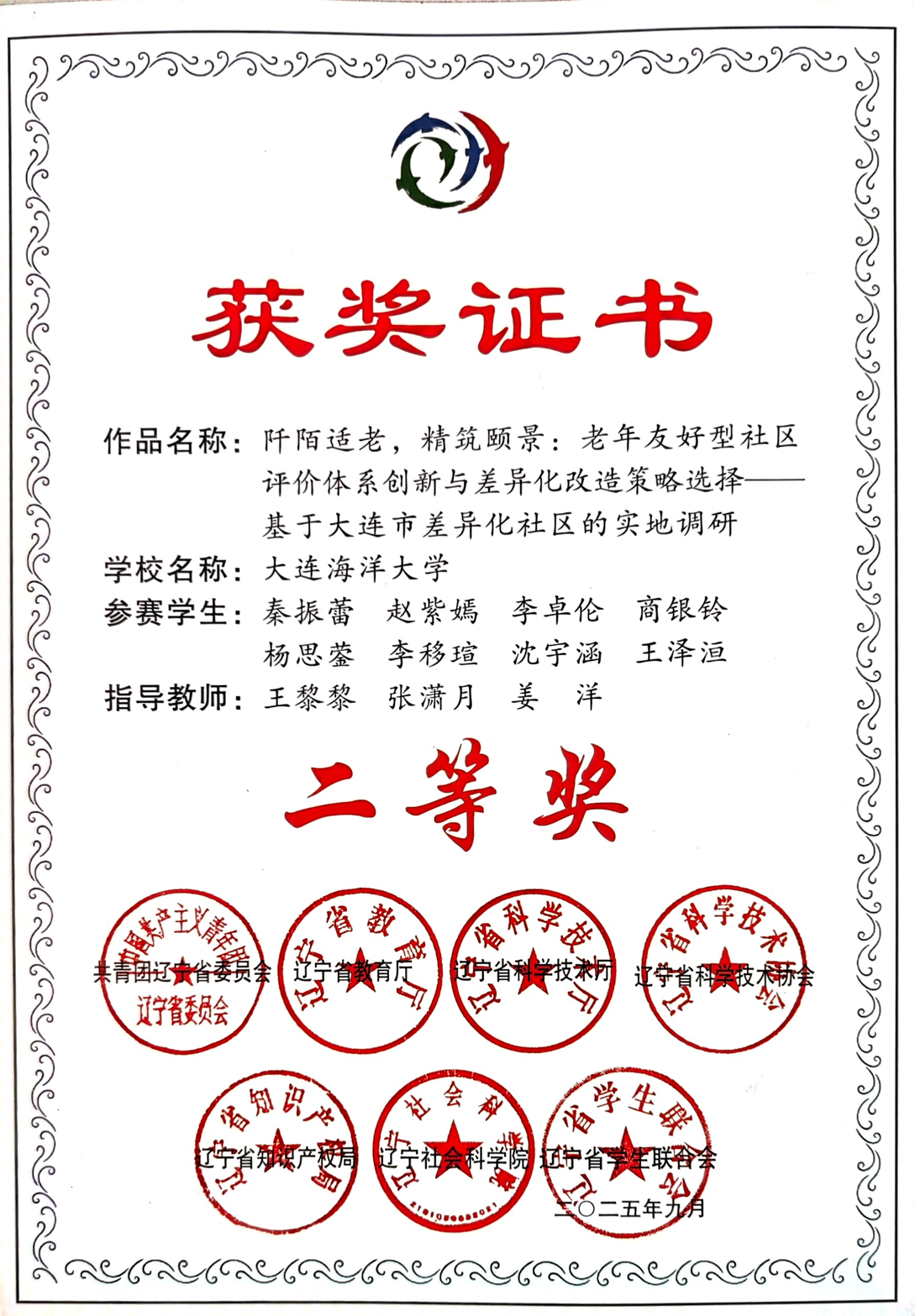 近日,由共青团辽宁省委员会、辽宁省教育厅等单位联合主办的第十七届“挑战杯”辽宁省大学生课外学术科技作品竞赛圆满收官。我院由秦振蕾、赵紫嫣、李卓伦等同学撰写的参赛作品《阡陌适老,精筑颐景:老年友好型社区评价体系创新与差异化改造策略选择——基于大连市差异化社区的实地调研》获得二等奖。