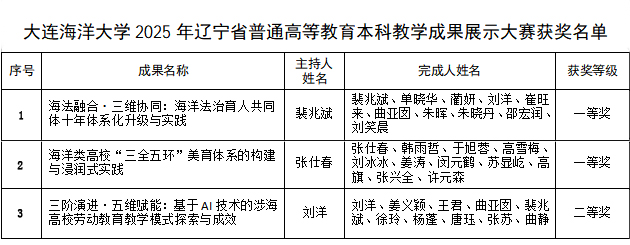 近日,辽宁省教育厅公布了2025年辽宁省普通高等教育本科教学成果展示大赛获奖成果名单,我院获一等奖2项,二等奖1项。